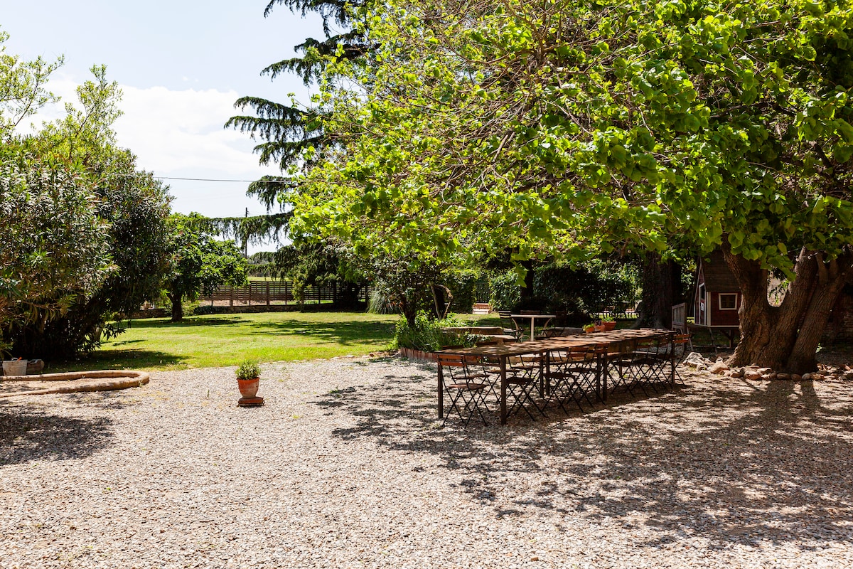 Isang maliit na bahay na may pakiramdam ng espasyo na napapalibutan ng kalikasan: isang napakalaking hardin na puno ng mga bulaklak at puno, dumadaloy na tubig, swimming pool, 2 terrace upang tangkilikin ang almusal sa araw ng umaga, isang tanghalian na languid na tinatanaw ang hardin at cocktail sa gabi upang ipagdiwang ang paglubog ng araw. May master bedroom, kuwartong may bunkbed, sofa bed sa sala. Isang magandang lugar para mag - unwind, magrelaks o magbatay ng mas malawak na aktibidad na bakasyon: Wala pang 60 minuto papunta sa Barcelona, mga beach ng Costa Brava, Waterworld, at paglalakad sa bundok.