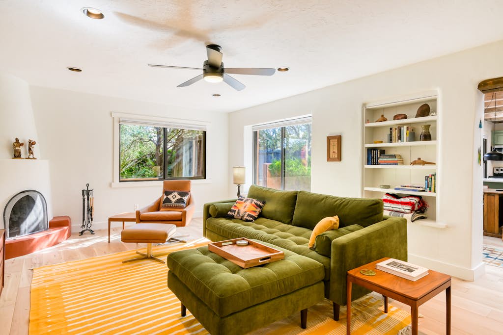 Napakalinis. Magugustuhan mong mamalagi sa isa sa mga pinaka - interesanteng kapitbahayan ng aming mga lungsod, kung saan nakatira ang mga lokal. May gitnang kinalalagyan ang Baca St, 1.8 milya lang ang layo mula sa plaza at hindi kalayuan sa Meow Wolf at mga pangunahing museo. Kami ay nasa isang lokal na lugar ng sining. Kung gusto mong manatili sa plaza sa lugar ng turista, hindi kami ito. Wala kaming TV kundi 300 MSP WIFI. Ang iyong napakalinis at eleganteng kuwarto, na puno ng eclectic art, ay may komportableng king size na kama, AC, couch na pampatulog, kumpletong kusina, refrigerator, mesa at pribadong patyo.
