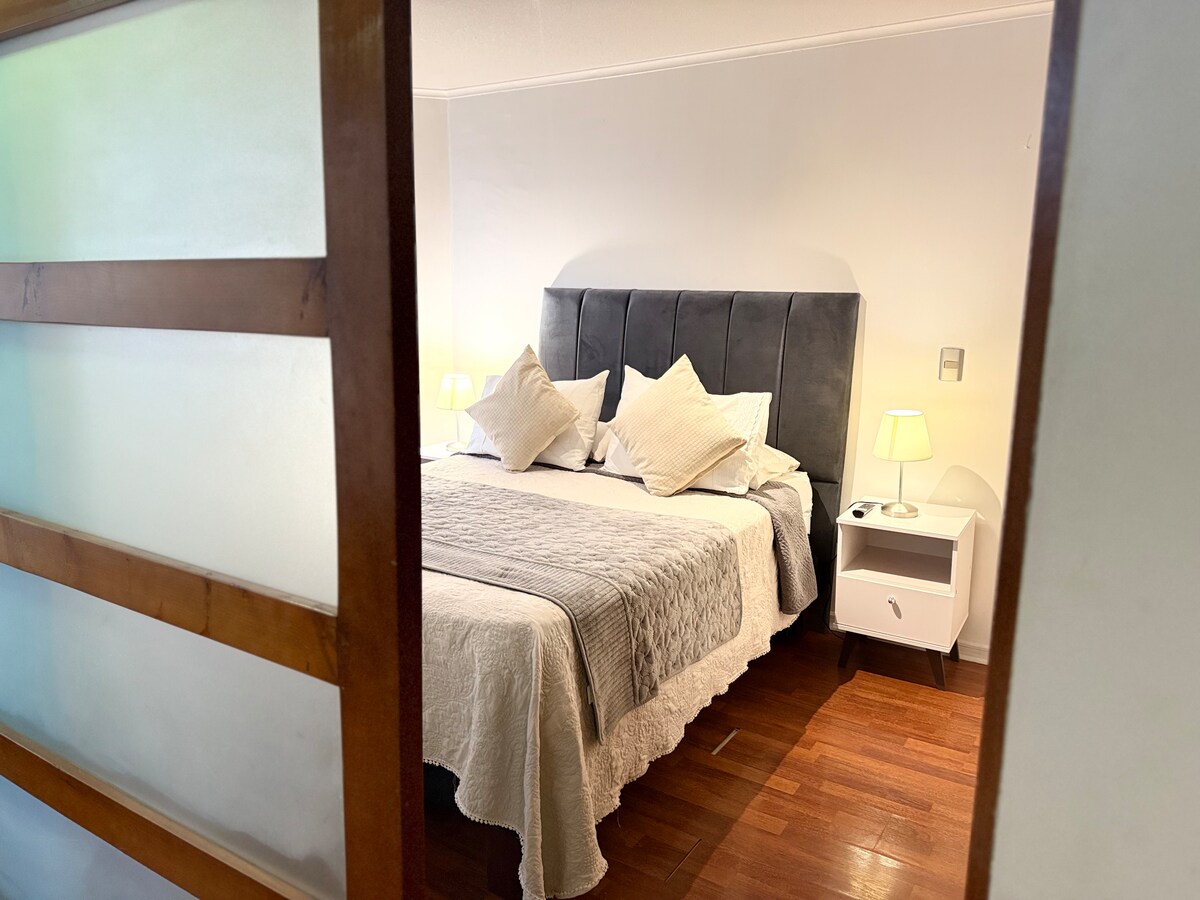 Magandang lokasyon para sa paglilibot sa lungsod ng Santiago, malapit sa Barrios Bellas Artes at Lastarria. Espesyal na samahan, napaka - komportable at kasama ang lahat ng kailangan mo para maramdaman mong komportable ka. Napakalapit sa Centros Comerciales, Mall, Plaza de Armas, Pharmacies, Super Mercado alado lang. 24 na oras na seguridad, digital lock para sa access sa apartment, na may double bed at sofa sa sala. Kumpleto na ito sa kagamitan. Smart TV na may teknolohiya - SMART TV.