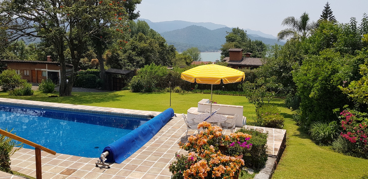 Napakagandang cottage ng pamilya, kung saan matatanaw ang lawa, 100 metro mula sa pasukan papunta sa Valle de Bravo at 15 minutong lakad ang layo mula sa baseboard. Nasa gitna ito ng maluwang at magandang hardin, na puno ng mga bulaklak at puno ng prutas. Mayroon itong pribadong pool na may solar heating at boiler at terrace na may barbecue na nagbibigay - daan sa iyong masiyahan sa kamangha - manghang tanawin Maraming kapayapaan at katahimikan ang lugar. 5 minutong lakad ang layo, matatagpuan ang lahat ng kinakailangang tindahan at restawran.
