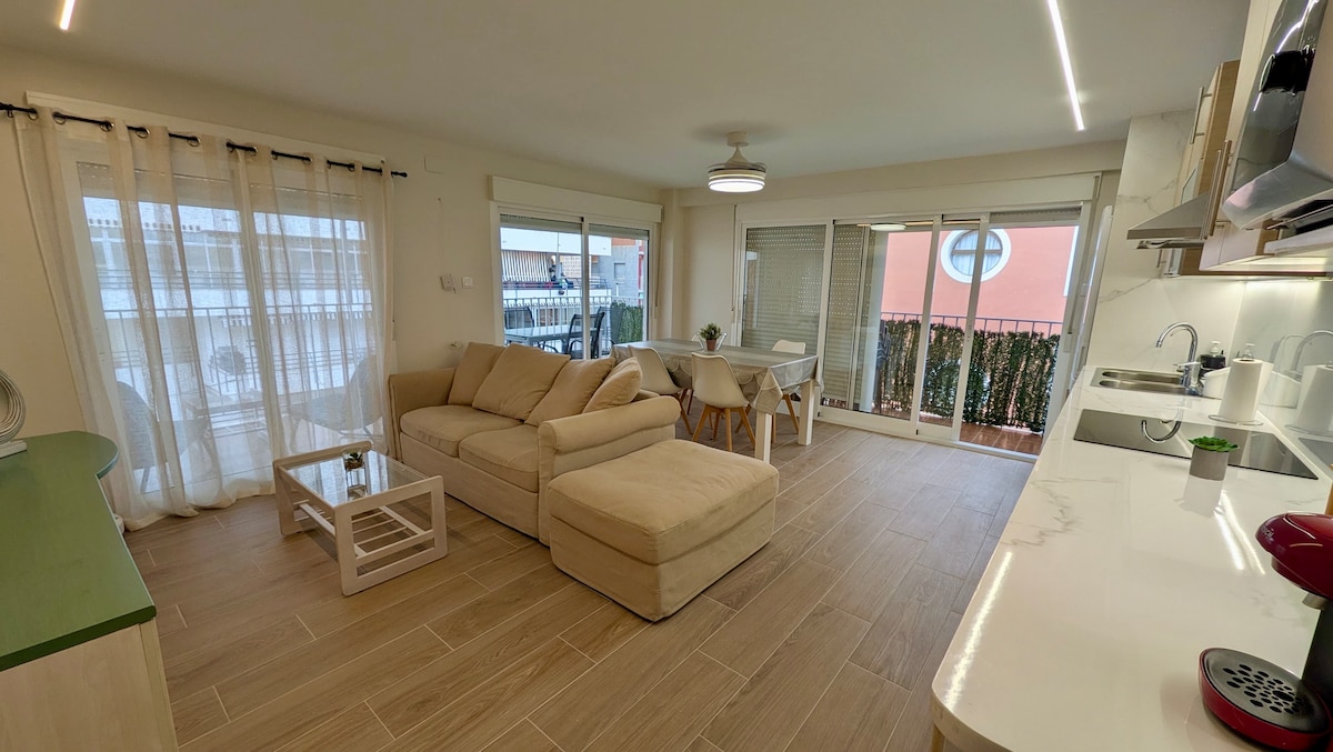 Maganda at maaliwalas na tirahan sa ika -1 palapag na may pribadong solarium, kusinang kumpleto sa kagamitan, banyo, silid - tulugan, sala na may Italian sofa bed at air conditioning, na perpekto para sa 4 na bisita na gumastos ng kaaya - aya at komportableng pamamalagi. Kasama sa pribadong urbanisasyon ang 2 swimming pool, lugar ng libangan ng mga bata at may bilang na sakop na parking space. Ito ay 1200 m mula sa beach at 100 m mula sa paglilibang at catering area. Bawal ang mga alagang hayop. Mga ipinagbabawal na party at event.