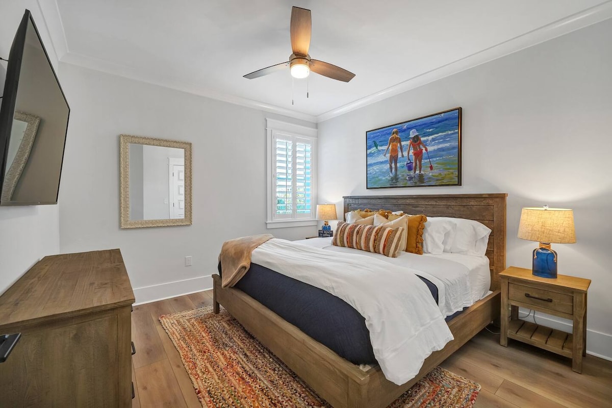 Maliit ang tangkad pero engrande ang disenyo, mapapa - wow ka sa 30A beach house na ito. Access sa pool, gym, at magagandang white sand beach na ilang bloke ang layo. Makikita ang Small Waves sa Blue Mountain Beach area, na kilala sa kagandahan nito, sa mga restawran nito, at sa sikat na ice cream shop nito. Mayroon kaming EV car charger para sa mga de - kuryenteng kotse (walang dagdag na bayad) kasama ang access sa electric golf cart (dagdag na bayad). May king size bed at twin bed ang silid - tulugan at mayroon ding 2 pang - isahang kama sa itaas.