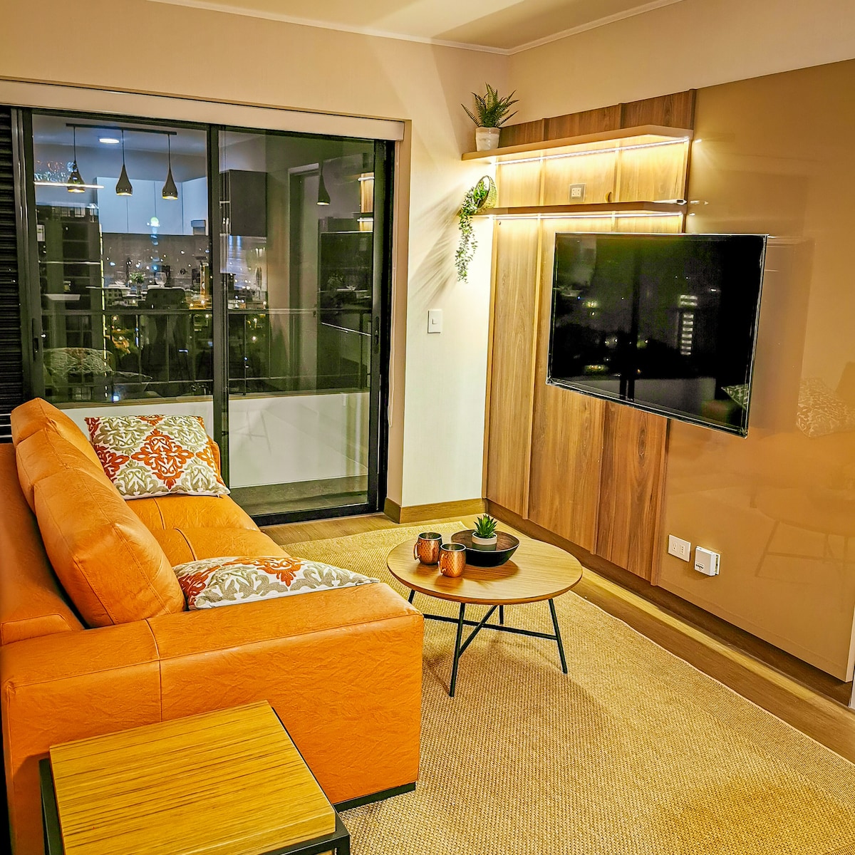 Moderno y acogedor departamento de una habitación, ubicado en zona estratégica de Barranco, límite con Miraflores, frente al MAC y a 5 min de Larcomar. Situado en el piso 9 con vista interna, cerca de museos, parques, bares y restaurantes. Ideal para parejas, viajes de trabajo o familias pequeñas. Equipado con TV en sala y dormitorio. Opcional: cochera y cuna corral. No está permitido fumar dentro del alojamiento.