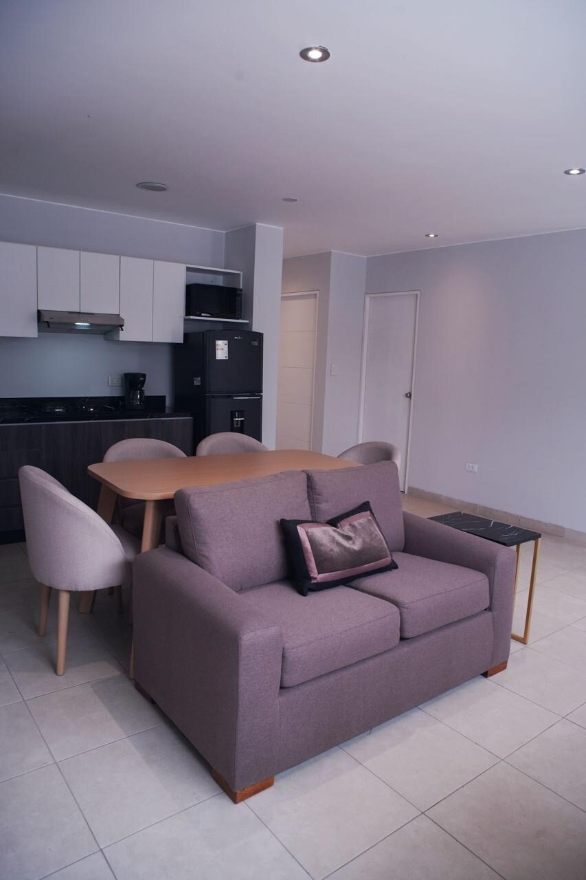 Modernong apartment na idinisenyo para sa aming mga bisita at nilagyan ng lahat ng kailangan para sa kanilang pamamalagi. Matatagpuan sa pinakaligtas na distrito ng Lima, ang kapitbahayan ng San Isidro (malapit sa mga pinansyal na lugar sa lungsod) na napapalibutan ng magagandang restawran at cafe, ang Lima Golf Sow (perpekto para sa mga hike, pagtakbo, biskwit) la PUCP Cultural Center (sinehan at teatro) ang Centenario el Olivar Park ( puno ng oliba at virreinal era), ang apartment ay nasa modernong bahay na may direktang access
