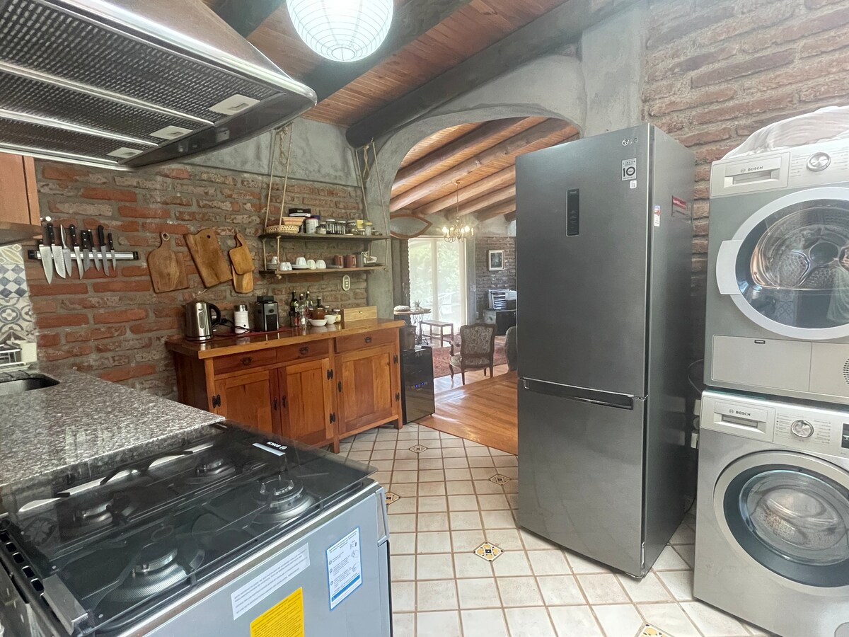 Isang palapag na bahay na yari sa luwad, na may pasukan papunta sa maluwang na sala na may mga kaaya‑ayang lugar para sa pagbabasa, silid‑kainan na nakakonekta sa kusinang kumpleto sa kagamitan, at lugar para sa paglalaba na nasa labas lang ng kusina at may dryer at pamplanong. Maluwang na kuwartong may closet at may dalawang banyo. Matatagpuan ito sa gitna ng ekolohikal na komunidad na Pañalolen. Ilang hakbang lang mula sa Trekkinn papunta sa Quebrada Macul Hill, 30 minuto mula sa metro, 10 minuto mula sa mga gym, restawran, cafe, sining, at shopping.