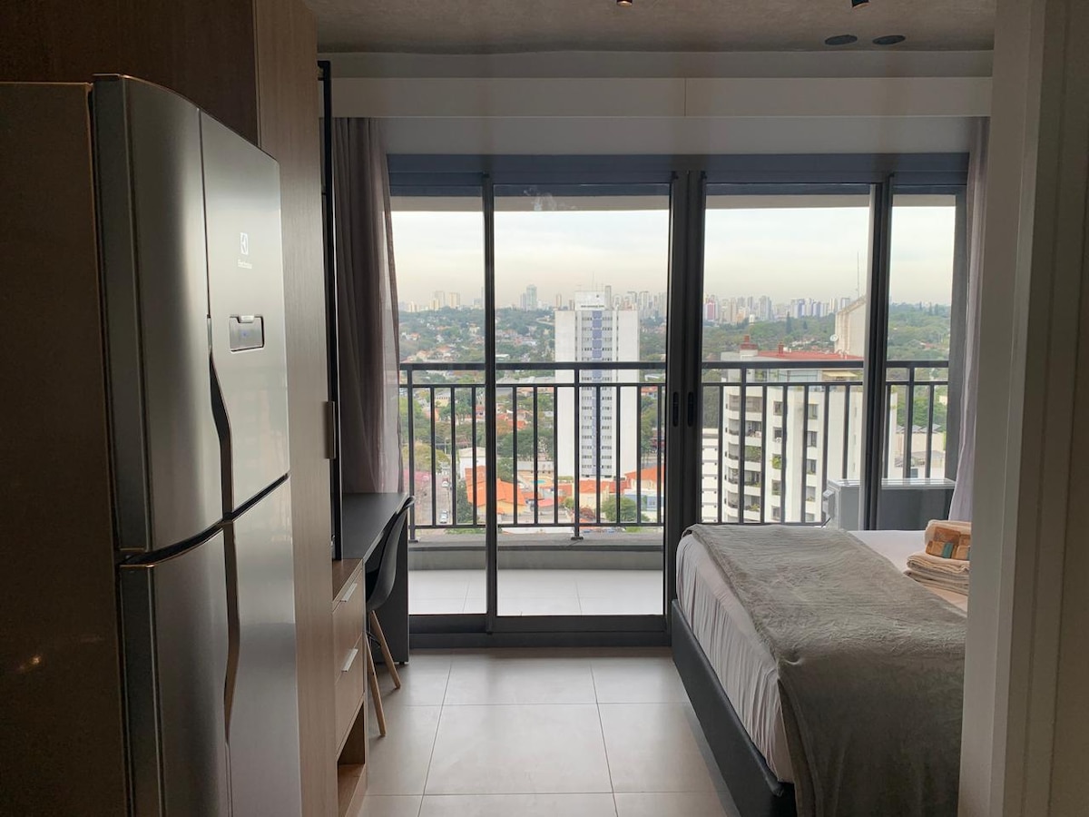Studio equipado com vista (18º andar). Apto está ao lado da estação Brooklin do metrô, e 12 minutos de carro até o Aeroporto de Congonhas. . >> Locais próximos: . Hípica Paulista . Clínica Einstein . Consulado Americano >> Shopping centers próximos: . Shopping Morumbi . Shopping D&D . Shopping Ibirapuera . Shopping JK Iguatemi >> Você terá no condomínio: . Portaria 24h; . Academia; . Lavanderia OMO; . Coworking