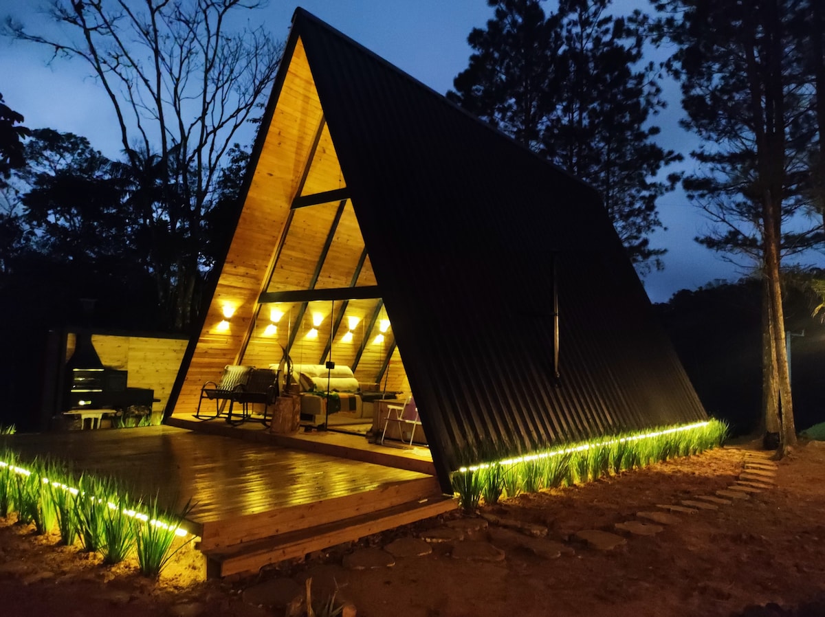Cabana confortável no meio do mato, com amplas janelas e varandas. Viva a sensação de estar numa casa na árvore. Planejada para se viver momentos únicos de conexão com a natureza. Você pode caminhar nas trilhas, pescar, andar no pedalinho, curtir o pôr do sol no Mirante da propriedade, fazer um piquenique no déque sobre lago ou simplesmente relaxar imerso na banheira de hidromassagem, na varanda, na cama ou no sofá, se aquecendo nas lareiras. Domingos check-out cortesia até às 18h.