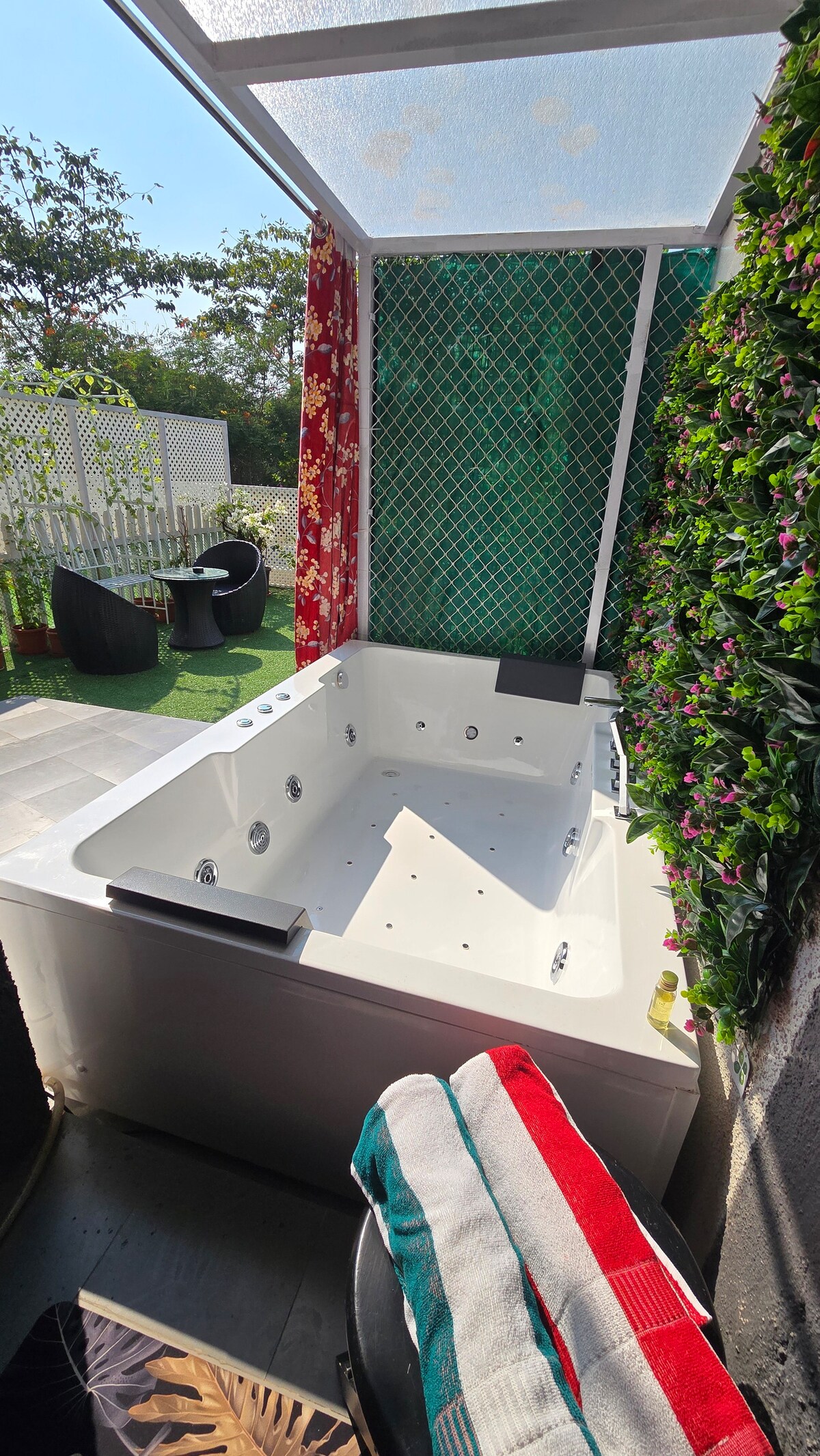 Boho Style Luxury Studio with Jacuzzi and Garden. A peaceful getaway. Fully loaded with WiFi, JBL 2.1 Home Theatre, BT Music System, Full-HD LED TV. A stylish bathroom with toiletries. Pantry with tea/coffee supplies, RO water, Microwave, Induction Hob, Fridge & s/w Toaster. Fenced garden for children. Dine in the garden with beautiful weather. Jacuzzi has hot water that can be used anytime. Common amenities on-site like swimming pool, games room, gym, mini theatre, cycling and restaurant.