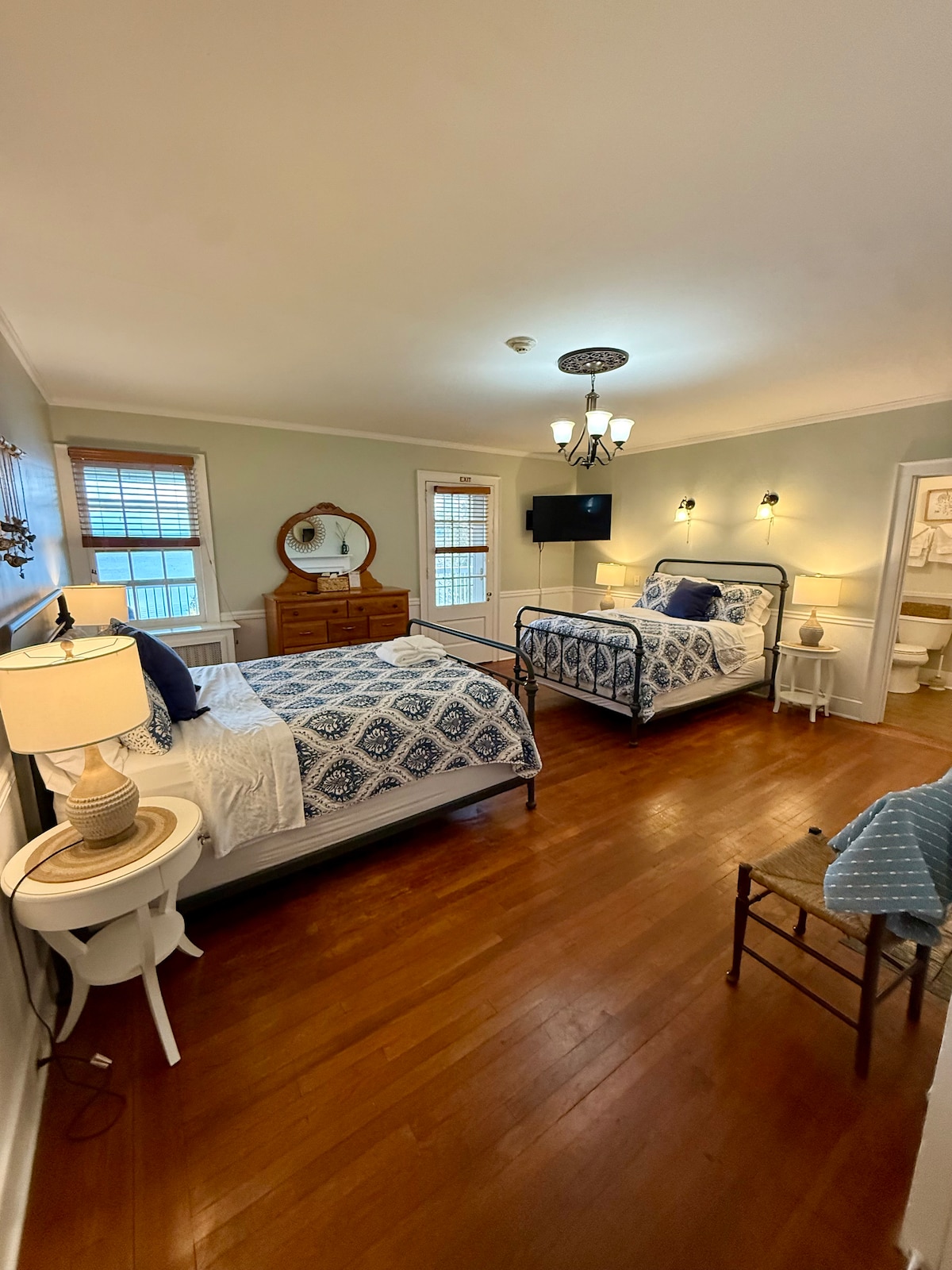 Sleeps up to 4 with two queen beds, sitting area with table and chairs, and a work desk. Includes a mini fridge, Keurig coffee, luxury bedding, and all the tech amenities you’re used to, like a Smart TV, voice-controlled Alexa, and USB charging stations.