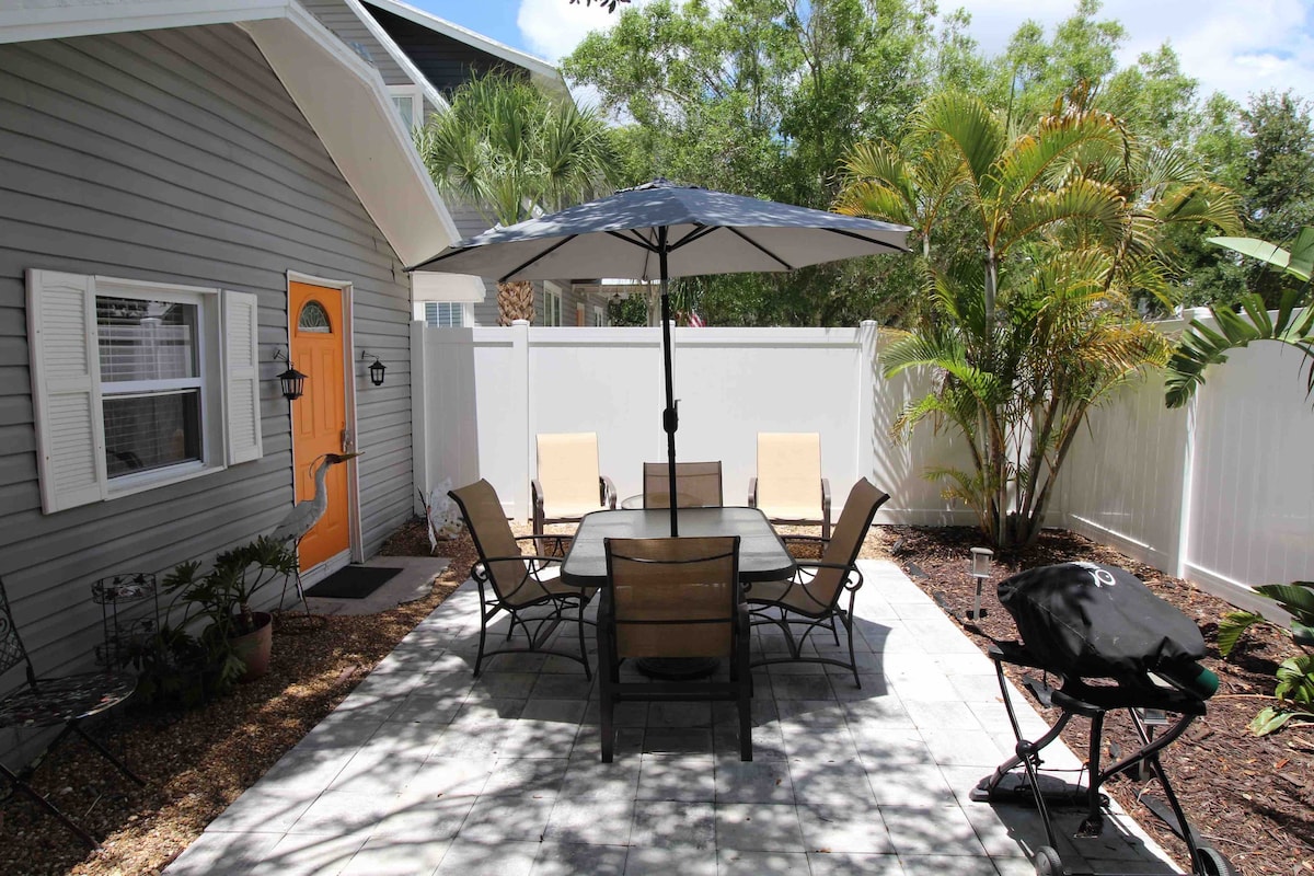 Itinayo ang cottage noong 1926 at nasa Makasaysayang Kapitbahayan ito. 10 minutong biyahe sa kotse ang aming lokasyon papunta sa #1 Rated Siesta Key Beach at maikling lakad papunta sa mga sikat na kainan at shopping area. Maaliwalas ang cottage at mayroon ng lahat ng pangunahing kailangan sa tuluyan. Pribadong pasukan, likod - bahay, maliit na kusina na may buong refrigerator. Tamang - tama para sa 2 tao ngunit kayang tumanggap ng higit pa. Malugod na tinatanggap ang mga aso