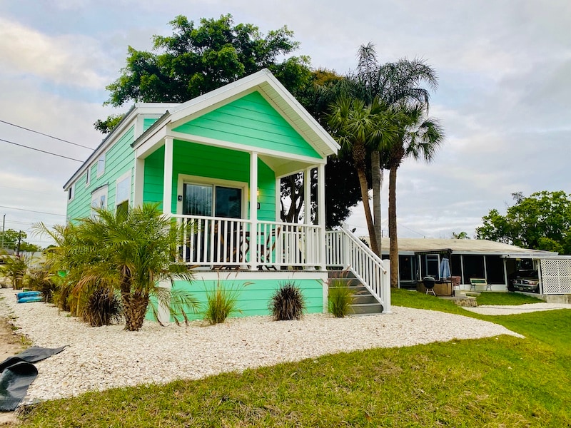 You are about to book a famous HGTV 270ft² / 25m² tiny home on a private 1.5-acre island! ☆ Walk to dining, nightlife, and shopping ☆ Fully equipped kitchen (K-cup) ☆ Backyard fire pit + BBQ ☆ Screened-in outdoor lounge w/ hammocks ☆ 415Mbps ☆ Smart TV w/ Netflix ☆ Memory foam bed ☆ FREE Bikes + kayaks + beach gear 3 min → Siesta Key Beach 7 min → Downtown SRQ 12 min → Myakka River State Park (river kayaking + wildlife viewing) We use a compost toilet. Please read house rules for info.