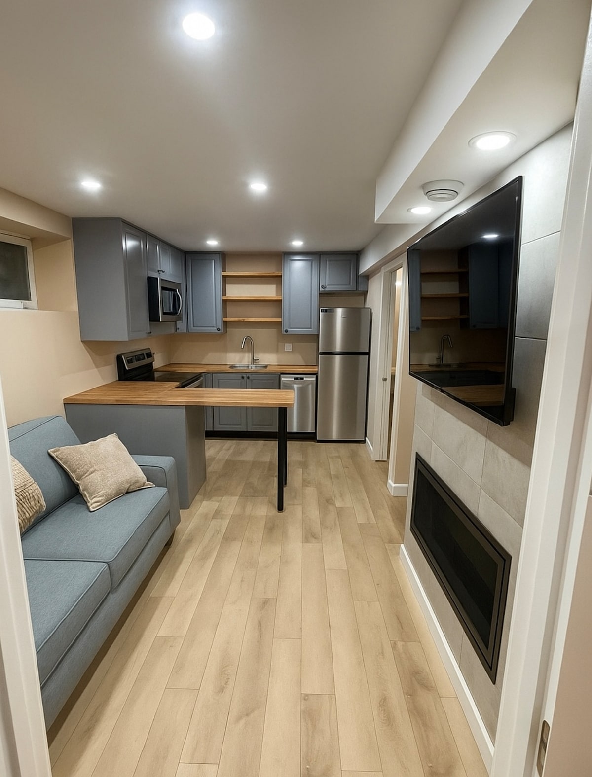 Maligayang pagdating sa iyong tahanan na matatagpuan sa gitna na malayo sa bahay. Magrelaks at itaas ang iyong mga paa pagkatapos ng isang abalang araw, manood ng pelikula sa malaking screen home theater, o mag - curl up sa harap ng fireplace na may magandang libro. Nilagyan ang malinis at modernong suite na ito ng kusina, dining area, kuwarto, at sala. Matatagpuan kami sa loob ng maigsing distansya mula sa ilog, UofS, Royal University Hospital, mga grocery store, Merlis Belsher Place, at 8th Street shopping area. 5 minutong biyahe lang ang layo ng downtown