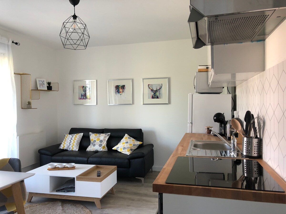 Maligayang pagdating sa kaakit - akit na apartment na ito Matatagpuan sa perpektong lokasyon, madaling ma - access at may libreng paradahan sa harap lang, ang 45 mÂČ cocoon na ito sa 2nd floor ay mag - aalok sa iyo ng lahat ng kaginhawaan na kailangan mo para sa isang kaaya - ayang pamamalagi. Masisiyahan ka sa nababaligtad na air conditioning para mamalagi sa anumang panahon, wifi para manatiling konektado, at overhead projector para magbahagi ng magagandang sandali ng pagrerelaks. Kumpleto ang kagamitan ng tuluyan para maramdaman mong komportable ka rito