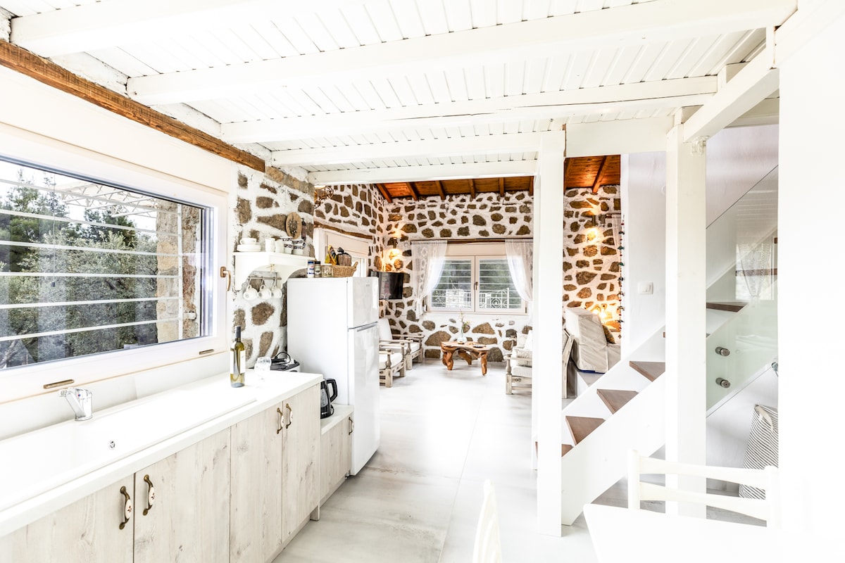 Villa kladi is located in the middle of our olive grove, on the border with the forest. Only for nature lovers "including its guests and rumors". To get to our house be ready for a mini off-road about 1km,(any car can come),between fragrant flowers, wild flowers and olive trees and sometime sheeps as well. The nearest beach can be reached by car in 5 min.The house have a really beautiful view to the sea