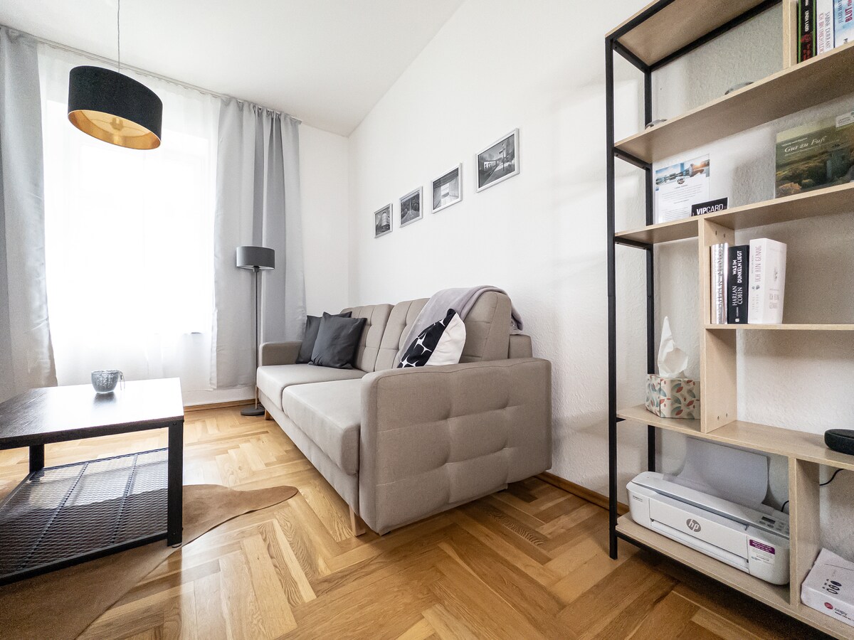 Mag - enjoy ng naka - istilong karanasan sa apartment na ito sa unang itaas na palapag. Sa sikat at perpektong matatagpuan na distrito ng Gohlis, may 2R_apartment na naghihintay sa iyo na may kuwartong may queen - size na double bed at maluwang na sala na may 1 sofa bed at dining area. Ang bukas at malaking kusina ay isa pang highlight ng naka - istilong at pinag - isipang apartment na ito. Siyempre, may libreng WiFi para sa aming bisita. May Netflix, Prime, at Live TV ang parehong TV.