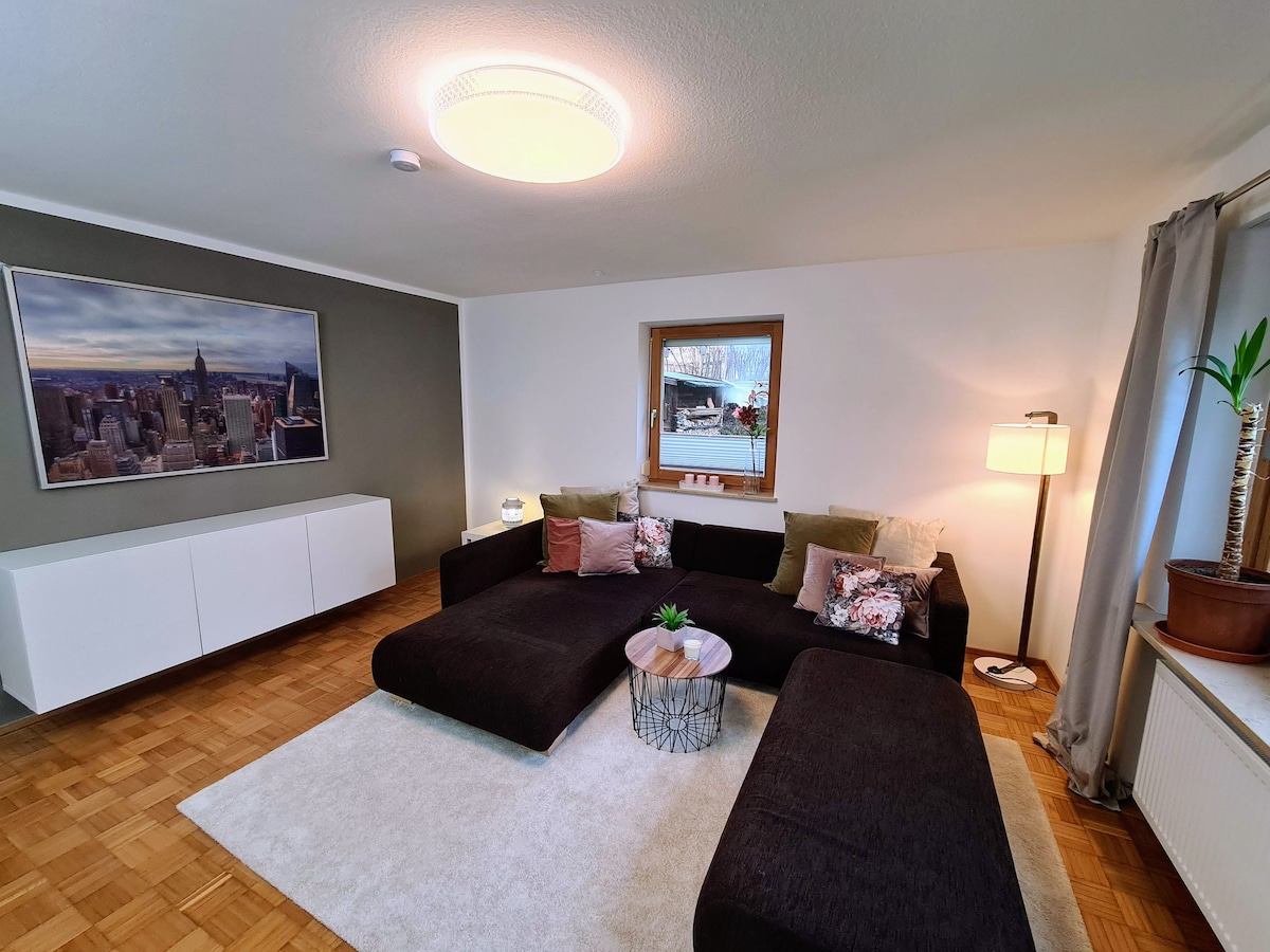 Nag-aalok ang magandang apartment ng humigit-kumulang 45 m² na living space na may sala na may TV, kumpletong kusina na may dining table, banyo, terrace, at silid-tulugan. May box spring bed (180 × 200 cm) sa kuwarto. May kasamang mga tuwalya, kobre‑kama, at hiwalay na pasukan. Posible ang paradahan sa kabaligtaran ng kalye. Humigit-kumulang 5 km ang layo ng Türkenfeld S-Bahn, at maaabot ang Munich sa loob ng 25–30 minuto sakay ng kotse.