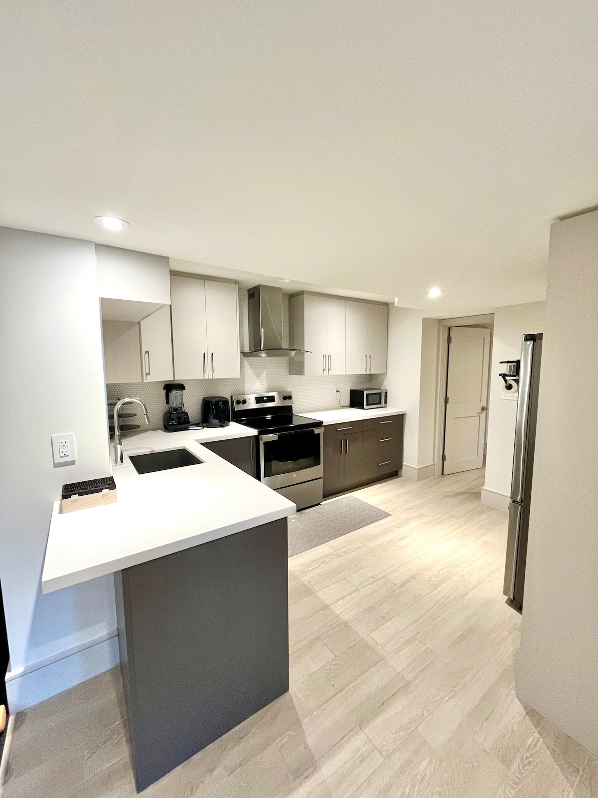 Hiwalay na Entrance ng Pribadong Suite. Malalaking Loungy Pribadong 2 silid - tulugan, sala, kusina na may hot plate refrigerator, dining area, banyo, labahan, EKSKLUSIBO PARA SA MGA BISITA LAMANG walang PINAGHAHATIANG lugar. Isang bagong na - renovate at magandang tuluyan. Bukas na konsepto ang mga mararangyang linen at ekstrang malambot na tuwalya, kainan, at sala, at eksklusibong available ito para sa mga bisita - walang pinaghahatiang lugar. Coffee - Tea bar area, mga libro, magasin at board game. Buong laki ng washer at dryer. Libreng Pribadong Paradahan sa driveway. EV charger