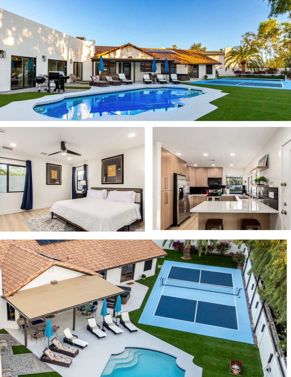 Remodeled 3700 sq.ft. modern Southwest home close to Old Town. Enjoy a free heated pool & hot tub, a large sports backyard, and outdoor kitchen. Perfect for a family vacation, golf trip, and group gatherings. Sleeps 12 people w/ 5 bedrooms, 4 bathrooms, 3 living spaces, 2 dining areas, and 2 fireplaces. The backyard is an outdoor entertainers dream with a built-in gas BBQ and side burner, dining area, fireplace, basketball court, putting green, cornhole, disk golf, large turf lawn, and 70" tv.