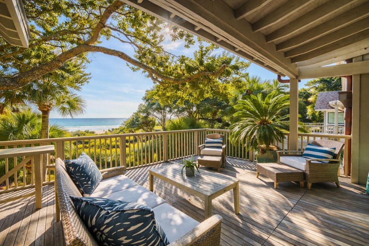 Ilang hakbang lang papunta sa beach ang Ocean Front Villa. Wildlife, Coastal Habitats, Sea Turtle Nesting, Bike Trails. 1 minutong lakad mula sa iyong beranda papunta sa beach. Tangkilikin ang mga tunog ng karagatan mula sa iyong covered porch. Perpekto para sa pagrerelaks, pagbabasa o pagtulog. Magandang lokasyon! Maikling lakad lang ang Night Heron Park. 30 milya ng mga trail ng bisikleta na natatakpan ng puno. Puwede kang sumakay sa beach! Puwedeng ipagamit at ihatid ang mga bisikleta mula sa ilang vendor. May bayad ang Golf at Tennis sa isla. Kinakailangan ang mga reserbasyon.