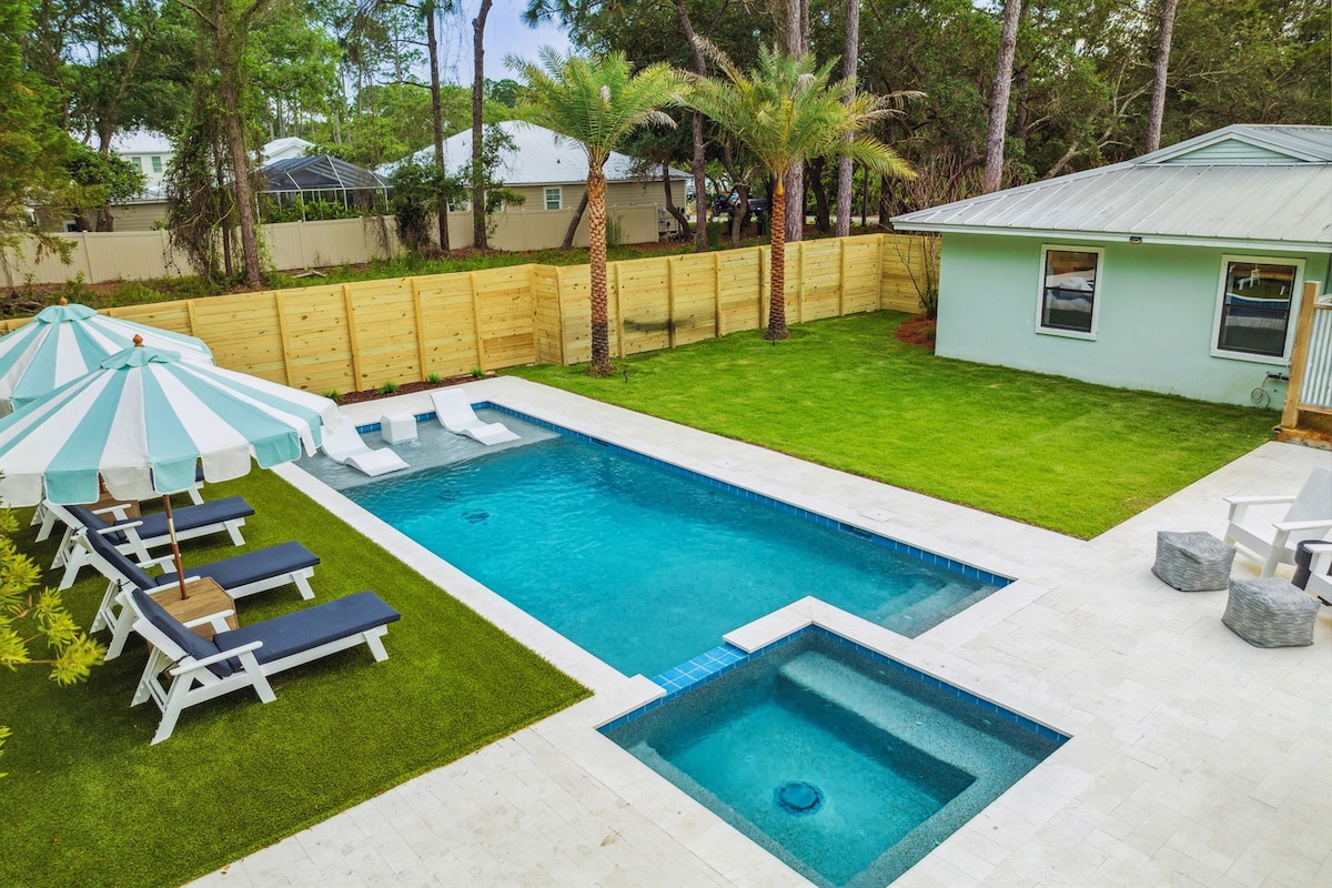 Want a true coastal experience? Vibe isn’t just another stale beach rental. It's a coastal living experience! Vibe's designer-renovation features hand-cut shiplap ceilings and local artisan hand-painted furnishings create a beach cottage feel that warms the soul. Take the free included 6 seater golf cart through Vibe's charming neighborhood to the sugar sand beach in under 3 minutes. Then return home to relax in your private screened seasonally heated pool and hot-tub.