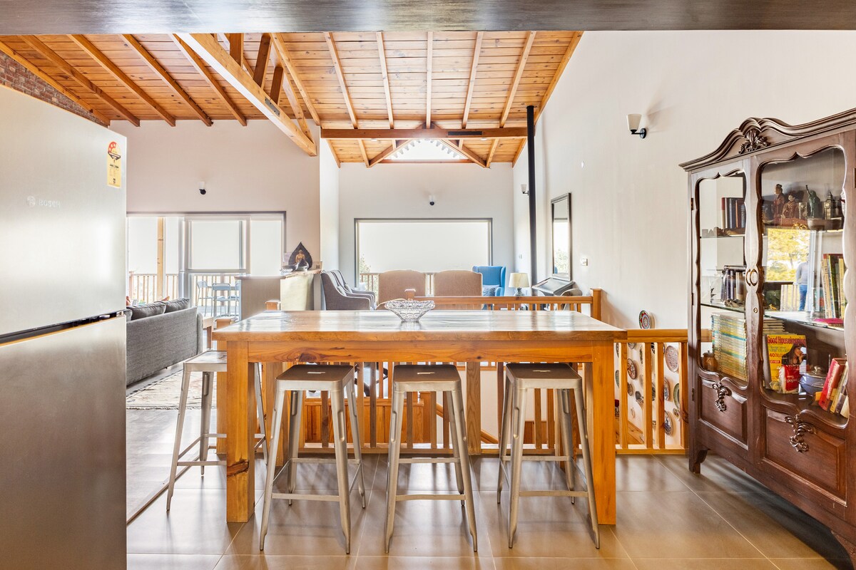 Matatagpuan sa gitna ng maaliwalas na puno ng oak, na may malawak na tanawin ng mga tuktok ng niyebe sa Himalaya, hindi lang homestay ang The Wood Owl Cottage. Ito ay isang tahimik na santuwaryo, kung saan ang bawat creak ng floorboard, kalat ng mga dahon, at bulong ng mga pakpak ay bumabati sa iyo tulad ng isang lumang kaibigan. Kapag pumasok ka, may matutuklasan kang maluwang na sala na may fireplace at kusinang may kumpletong kagamitan, dalawang silid - tulugan, attic studio na may viewing deck, 3 toilet, at powder room na maraming sit - out area at mga lugar na pinagtatrabahuhan.