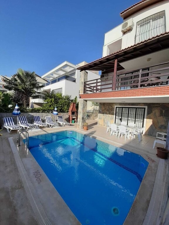 Kuşadası’ında TURİZM BAKANLIĞINA KAYITLI,Yanyana,müstakil,özel havuzlu 4 adet villa,denize 1500m.300 m2.Bahçe içerisinde,etrafı çevrili,mahremiyet alanlı,özel açık otopark,barbekü,şezlong, bahçe masa sandalye takımı,şömine,4 yatak odası(herbirinde çift kişilik yatak)1 salon,yeni eşyalı,tüm beyaz eşya ve mobilyalar,ankastre mutfak,tüm mutfak ekipmanları(çaycı,tabak,çatal bıçak takımları,tencere tk.vs salon ve odalarda klima,24 saat sıcak su,saç kurutma mak.havlu,ütü,yürüyüş mesafesinde avm/market