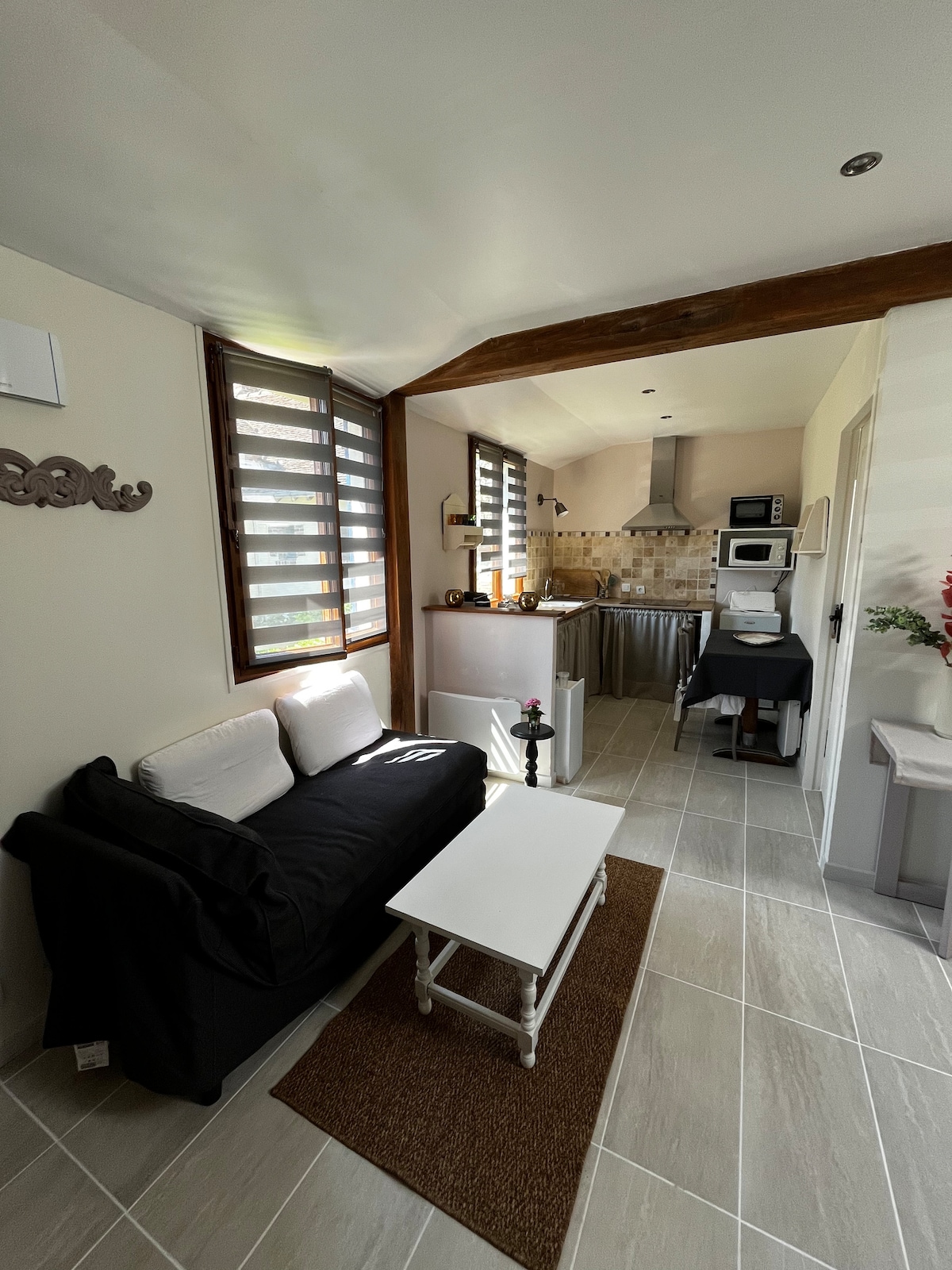 Sa makasaysayang sentro ng nayon, na nakaayos sa isang lumang kamalig, ang 50m2 na tuluyan ay may balneo bath at pribado at mapayapang bakuran na may mga tanawin ng mga puno. 2 minutong lakad mula sa panaderya at grocery. Sa tabi ng tuluyan, tumutunog ang simbahan kada oras, kahit sa gabi (para sa mga taong sensitibo sa ingay, magdala ng mga earplug).