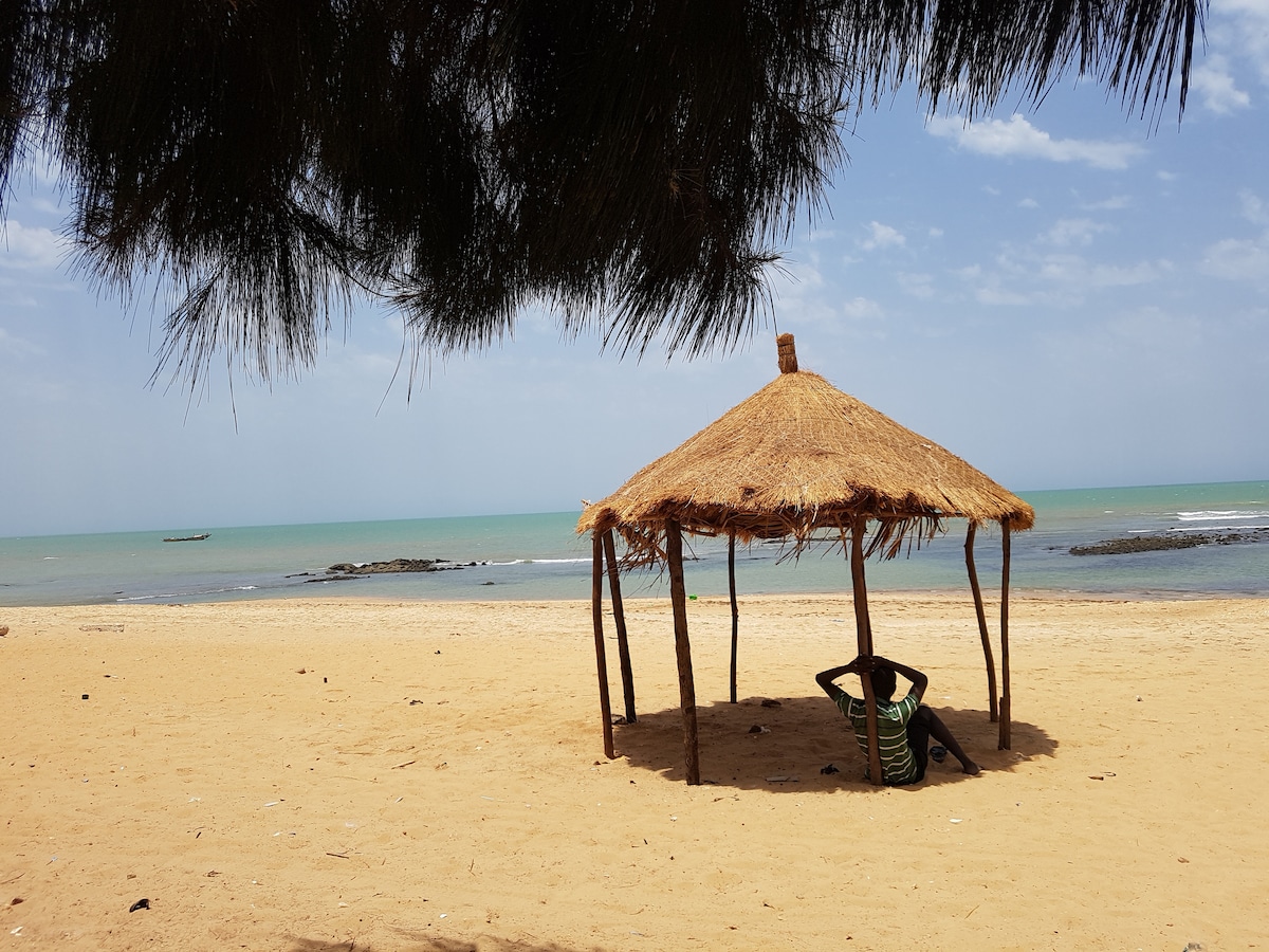 Quietly located on the most beautiful beach in Senegal, in Niakh Niakhal. Equipped with every comfort: air conditioning, indoor and outdoor kitchen, gas BBQ, bar with lounge, covered terraces, private pool, private parking, each room with sea view, petanque court,... A sympathetic couple takes care of your daily cleaning and breakfast (on request we can also provide lunch or dinner), accompany you during excursions, do the shopping, ... Our car (7 p) on site with driver + 2 MTBs available