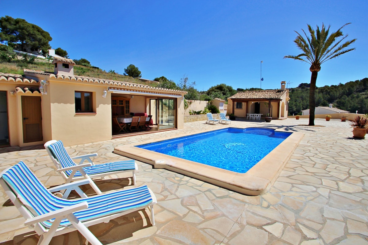 Kamangha - manghang villa na may estilo ng Mediterranean na may apat na double bedroom, maluwang na pribadong pool, hardin at malalaking outdoor space. Matatagpuan 2km mula sa beach (6 min sa pamamagitan ng kotse) at 1km mula sa makasaysayang sentro ng Jávea. Ang bahay ay may 3 banyo, isang glass porch, isang glass porch, isang maluwang na living - dining room na may sofa bed at 2 kusina, ang isa sa mga ito sa labas na matatagpuan sa isa pang bukas na beranda na nagtatampok ng barbecue at isang malaking mesa para sa mga panlabas na pagkain. Six - No - Next - 📞 Ocho - Cinco - Tres - Dos - Cero - Uno