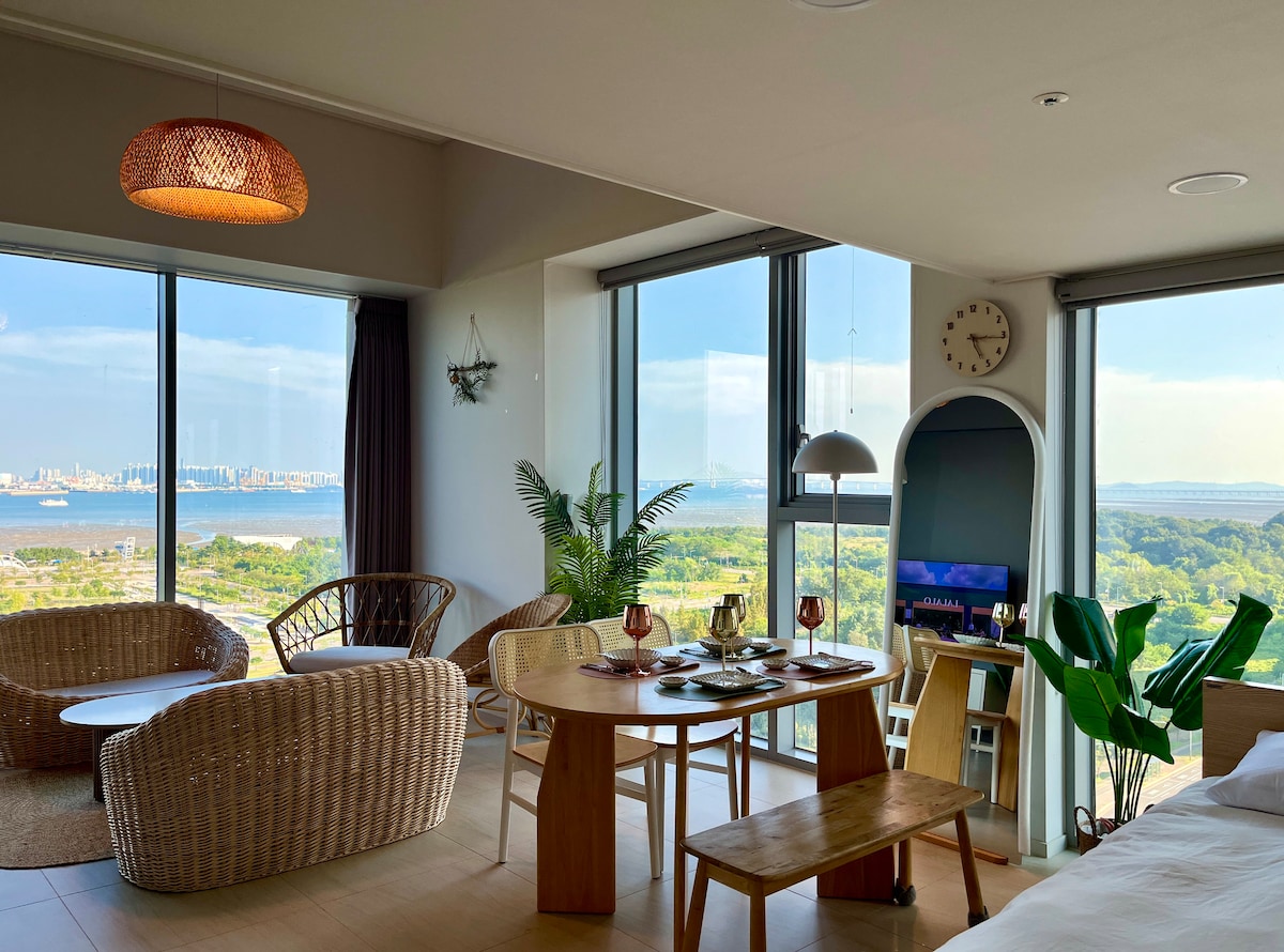 [HARU STAY, #3] Ang 'Haru Stay' ay isang lugar kung saan mayroon kang comma (,) motif sa iyong pang - araw - araw na buhay:) ๐Pag - check in ng PM 5: 00 ๐Mag - check out nang 1:00 PM (โปKung mayroon kang anumang tanong tungkol sa pag - check in at pag - check out, ipaalam ito sa amin nang maaga. Puwede kang gumawa ng ilang pagsasaayos nang walang dagdag na bayarin๐) Isang lugar kung saan maaari mong harapin ang magandang West Sea at maliit na isla mulchido sa sandaling buksan mo ang pinto ng bahay! Maaari mong maramdaman ang kaginhawaan at kasiyahan ng interior na gawa sa kahoy at asul na konsepto na kahawig ng dagat ng Yeongjongdo at ang cool na tanawin ng mataas na palapag.๐ 20 minuto ang layo nito mula sa Incheon Airport, kaya kung bibisita ka bago ka bumiyahe โข o para mapawi ang iyong pagod na katawan at isip sa sentro ng lungsod, magkakaroon ka ng magagandang alaala at komportableng oras! Available ang istasyon ng pagsingil ng de - kuryenteng ๐kotse/Libreng paradahan sa paradahan sa ilalim ng lupa โปHuwag magluto nang may malakas na amoy! Kung masyadong masama ang amoy, maaaring singilin ka para sa paglilinis ng kuwarto.๐ญ Bukod pa rito, responsable ang mga bisita sa mga pinsala para sa mga aksidente at pagkalugi sa kaligtasan dahil sa kawalang - ingat sa kuwarto.