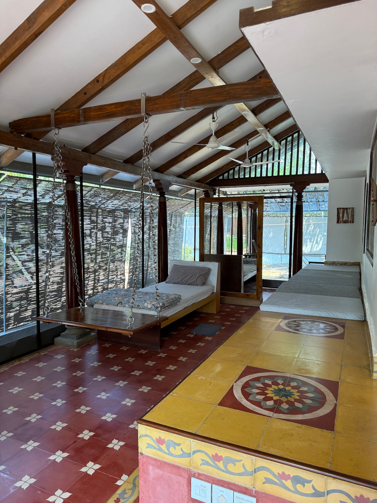 Your home away from home in Auroville has been tastefully decorated to a Chettinad theme. Every corner of our home is Instagramworthy with colourful interiors, kolam art, antique decor and more. The 1BHK can comfortably accommodate up to 4 persons with a swing bed and sofa bed in the living room. hile there are plenty of restaurants nearby, our kitchen has been thoughtfully equipped for all your needs - be it to make a quick omelette or a full Indian meal. So sit back, relax and sip your coffee.