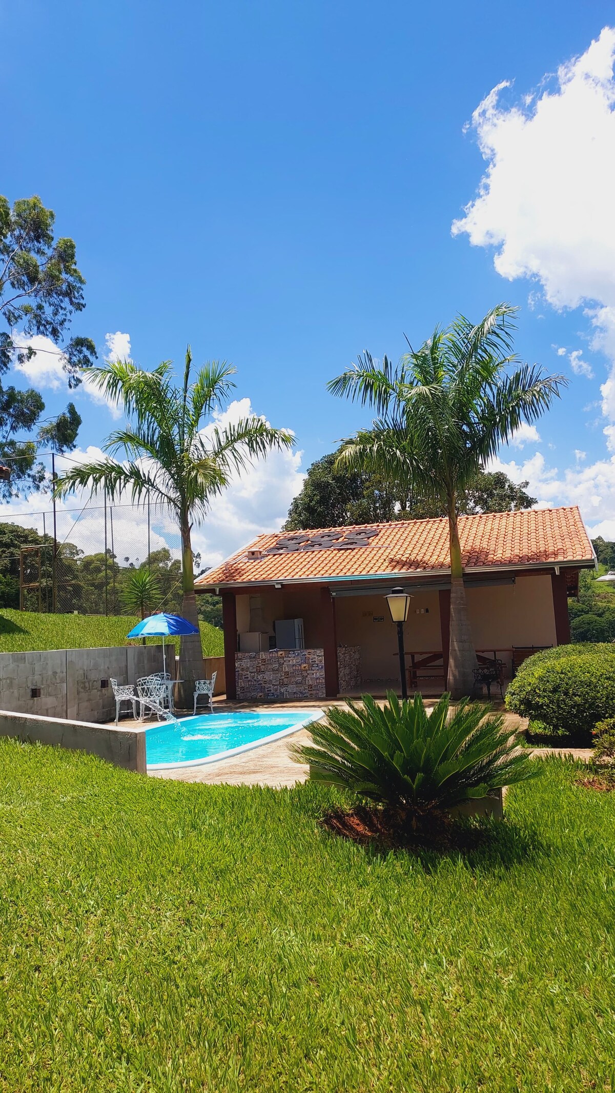 Magrelaks kasama ang pamilya sa tahimik na tuluyan na ito kung saan matatanaw ang mga bundok. Chácara na matatagpuan sa isang condominium, malapit sa sentro ng lungsod at ilang kilometro mula sa mga nakapaligid na bayan May mga kagamitan sa kusina, refrigerator, freezer, cooktop stove, de - kuryenteng oven, coffee maker, at barbecue sa tuluyan. Wifi Mga Tagahanga 32 pulgadang TV na may cable TV Panlabas na banyo na may toilet shower. Hindi ito nag - aalok ng mga sapin sa higaan, mesa at paliguan, unan at gamit sa banyo.