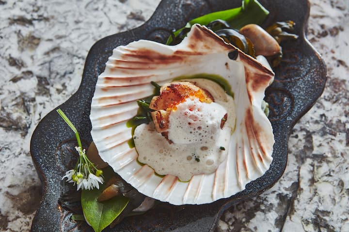 • Hand-dived Isle of Mull scallop, Shetland mussels, celeriac, seaweed, at champagne velouté