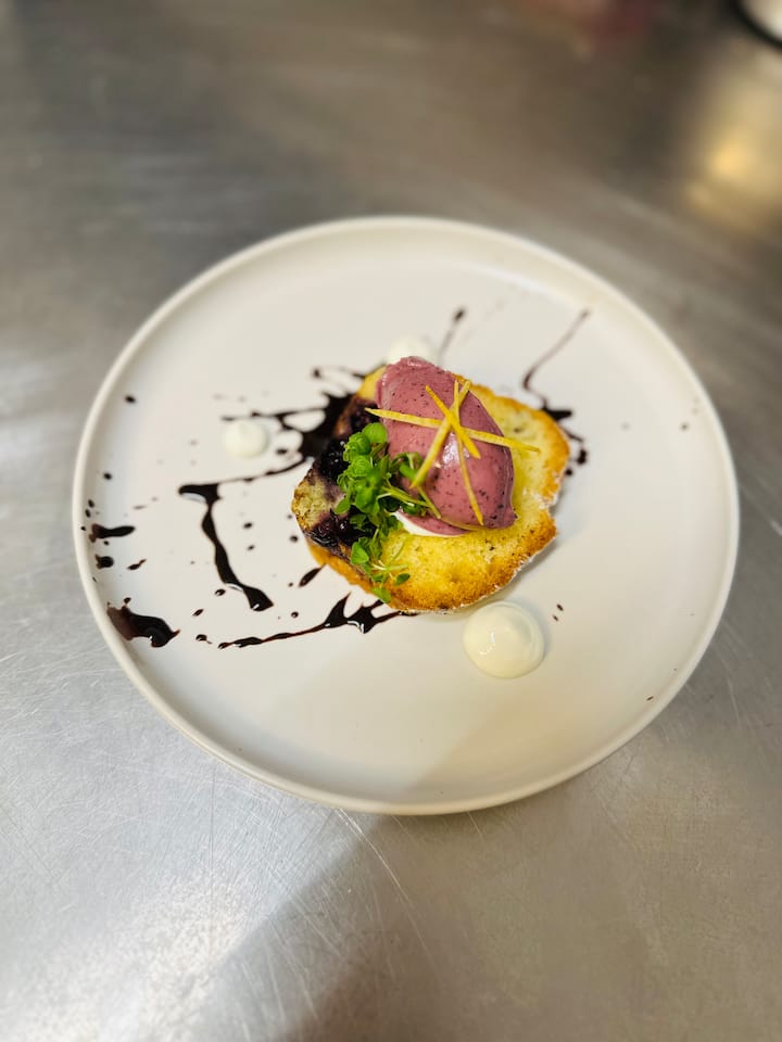 - wild blueberry plum cake na may maasim na yogurt at blueberry ice cream, candied lemon at persimmon sauce