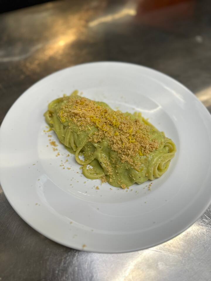 - pappardelle na may 40 egg yolks, kape, cherry tomatoes, coffee powder at shallot confit