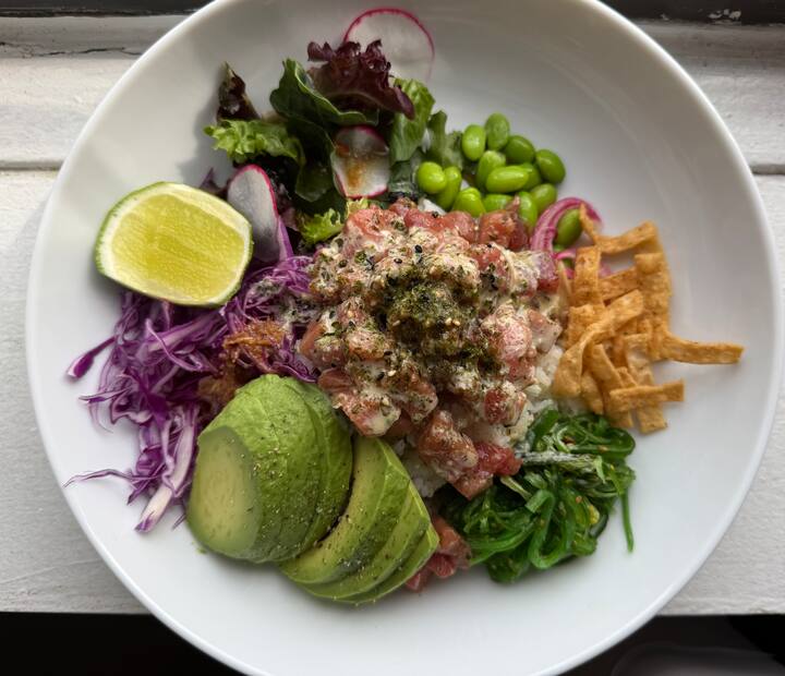 Poke bowl na may sariwang marinated na tuna at sariwang gulay