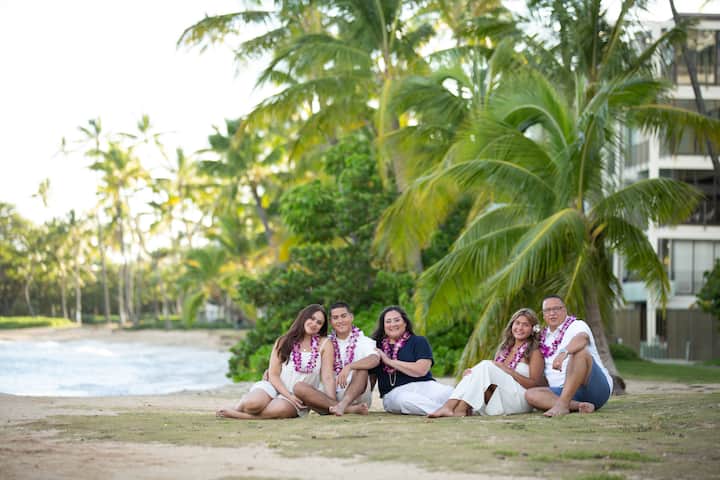 Kasama sa pampamilyang package ang mood board na magagamit para sa pagpapalit ng damit. Makikita online ang buong gallery sa loob ng isang linggo, na may 45 high‑res na kuha na pinili at na‑download ng kliyente, na handa nang i‑print. Kasama sa bayarin ang lahat ng bayarin sa permit ng lokasyon at pangkalahatang insurance sa pananagutan. May bayad na $50 hanggang $100 para sa mga lokasyon sa labas ng lugar ng Honolulu.