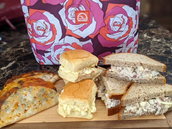 Handang dalhin na kumpletong tanghalian para sa picnic. May kasamang mga sandwich na pipiliin mo, pasta salad, prutas ayon sa panahon, at sariwang lutong cookies.