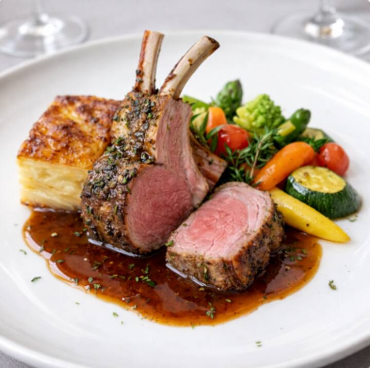 Itinatampok sa opsyong ito ang mga de-kalidad na sangkap para sa isang elegante at magandang karanasan sa pagtikim sa bahay. Bilang pampagana, isang masarap na tartlet na may mga gulay ayon sa panahon. Para sa pampagana, sea bream carpaccio na may mga citrus fruit, pinaganda ng fruity olive oil, luya, salmon roe, at lemon caviar. Para sa pangunahing putahe, may inihaw na tupa na may kasamang gratin dauphinois, mga gulay ayon sa panahon, at lemon‑thyme jus. Para sa panghimagas, Menton lemon tart na may Italian‑style na meringue sa ibabaw.