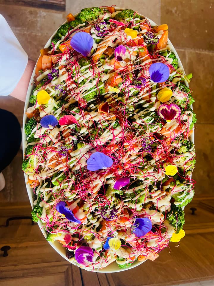 Hango ang pagkaing ito sa mga produktong mula sa pamilihan at sa mga lasa ng Mediterranean, at nagtatampok ito ng mga sariwang sangkap ayon sa panahon. Para sa pampagana, may pana‑panahong salad na may malulutong na gulay, en papillote na itlog, at magaan na sesame‑puree vinaigrette.