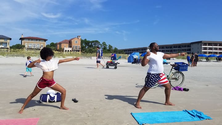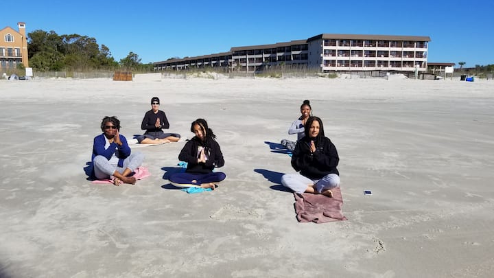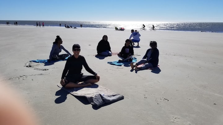 Magaan na yoga sa beach. Magdala ng tuwalya o banig, magbihis para sa yoga, at magdala ng mga salaming pang - araw.
