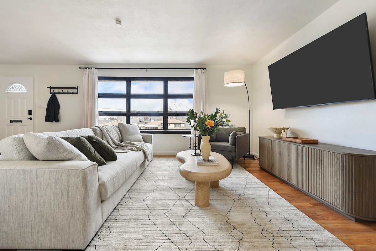 Inayos na 4BR/2BA sa tahimik na East Liberty cul-de-sac—perpekto para sa mga pamilya, kaibigan, at work trip. • 8 ang kayang tulugan (King + 2 Queens + daybed w/ trundle + sleeper sofa) na may espasyo para magpalawak. • Mag‑enjoy sa game room at opisina sa basement (PS4, 75" 4k smart TV, standing desk + 32" monitor), at kusinang kumpleto sa kagamitan para sa pagluluto. • Madali ang pagdating dahil may sariling pag‑check in, pribadong paradahan sa garahe, charging station para sa EV sa ika‑2 palapag, at internet na 1 gig ang bilis.
