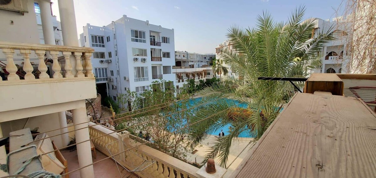 Ang flat ay ganap na na - renovate, ito ay dalawang silid - tulugan at dalawang banyo isa sa mga ito sa master room, ang mga nangungupahan ay may karapatan na gamitin ang compound beach na kung saan ay footstep pababa mula sa compound, ito ay kilala bilang isa sa mga sikat na dive site sa Sharm Elsheikh, may restawran sa beach na naghahain ng almusal, tanghalian, at hapunan, at may beach bar ito na naghahain ng lahat ng uri ng inumin.