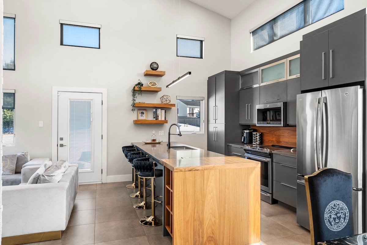 Magpahinga sa tahimik at modernong spa sa Dieppe. Mag-enjoy sa pribadong hot tub, indoor infrared sauna, at 100-inch projector para sa cinematic na karanasan. May Bellini-style na modular sofa, sculptural na upuang donut, at textured rug ang tuluyan, at may mga detalye ng marmol at chrome para maging komportable at makabago ang dating. Malapit ito sa mga atraksyon ng Moncton at perpekto para sa mga mag‑asawa o solo traveler na naghahanap ng kaginhawa at estilo. Ilang minuto lang mula sa downtown, at madali itong puntahan ang mga restawran, café, at tindahan.