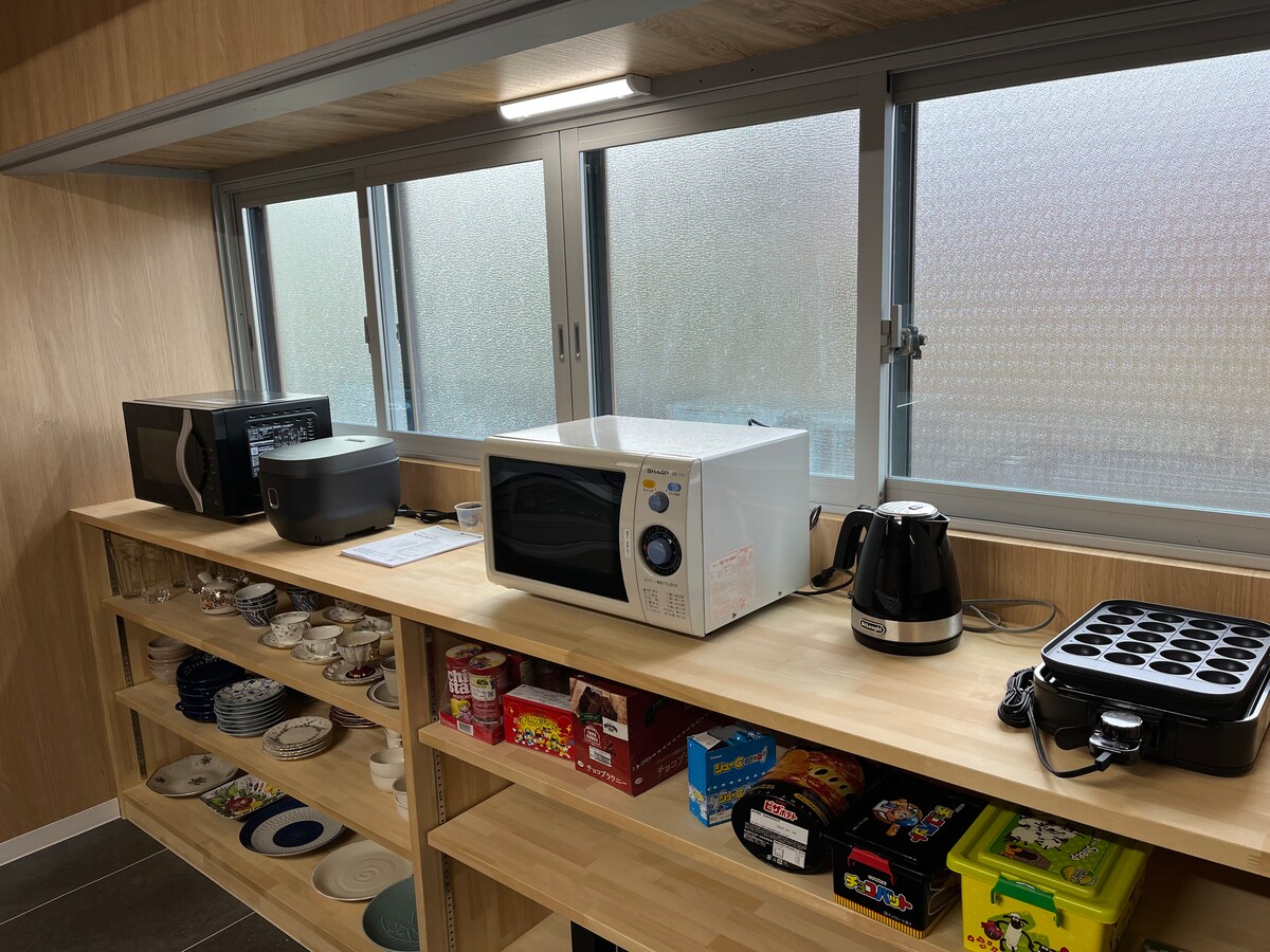 Puwede kang magrelaks kasama ng iyong mga kaibigan sa paligid ng fireplace.Masisiyahan ka sa mga paliguan ng Goemon, kamados, at lumang mabagal na buhay habang nararamdaman mo ang panahon sa hangin at kalangitan (may kalan ng cassette, heater ng IH, at shower).Puwede ka ring magluto gamit ang kalan ng kahoy at BBQ sa labas. 10 minuto sa pamamagitan ng kotse mula sa istasyon ng Izumo - shi.25 minuto ang layo ng Izumo Taisha Shrine.May hot spring din sa malapit.Pribadong kuwarto ang 20 tatami mat na kuwartong may estilong Japanese, at pinaghahatian ang kusina at banyo.May tanggapan ng disenyo sa warehouse, at kapag weekday, nagtatrabaho ako mula 8:30 hanggang 18:00.Puwede ka ring gumamit ng mga thatched booth na may tanawin. Mayroon ding air conditioning, ngunit sa tag - init, kung bubuksan mo ang rim at isabit ang lamok, iniimbitahan ka ng hangin sa gabi ng tag - init na matulog nang maayos.Mula tagsibol hanggang taglagas, may mga nostalhik na tinig tulad ng mga palaka, higrassi, at suzuki. Kung hindi ka pamilyar sa sunog o sunog sa uling, tutulungan ka namin kung tama ang oras.Libre ang kahoy na panggatong. Magdala ng uling para sa barbecue kung gagamitin mo ang fireplace. 1, 6 na kilometro papunta sa supermarket, at 5 kilometro papunta sa istasyon ng Izumo - shi. Mainam na maglakad at mag - jog sa field road, river bank, atbp. nang maaga sa umaga. Hinihiling ang mga alagang hayop sa sahig ng dumi.Sa Hulyo at Agosto, gamitin ang bullbury sa hardin.