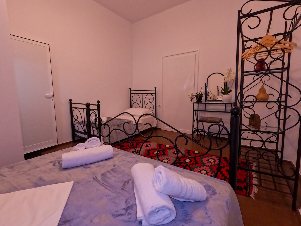 Nag - aalok ang mga marikit at eleganteng kuwarto ng lahat ng kaginhawaan ng bahay, heating at air - conditioning, high - speed internet,parquet, hardin, refrigerator, mga pasilidad ng kape at tsaa, libreng Wi - Fi at mga TV channel.