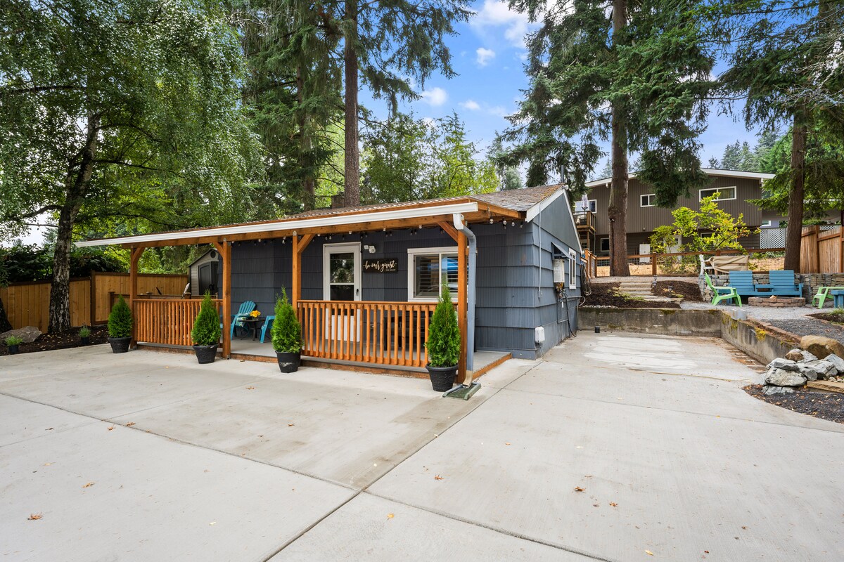 Matatagpuan ang komportableng 650 talampakang kuwadrado na Pacific Northwest cottage na ito sa hardin na malayo sa kalye. Shade & sun. Ito ay isang kumpletong bahay. Kasama sa Eclectic na palamuti ang antigong banyo, claw foot tub na may opsyonal na shower, bukas na kusina na maaari mong talagang lutuin, coffee nook at dinning room area, buong sala, silid - tulugan, mga aparador atbp. Pribadong drive at paradahan. Huminto ang bus sa harap. Maraming puno ang kapitbahayan, tanawin ng mga bundok na natatakpan ng niyebe, maikling biyahe papunta sa mga beach, mga internasyonal na restawran. 12 milya papunta sa Seattle.