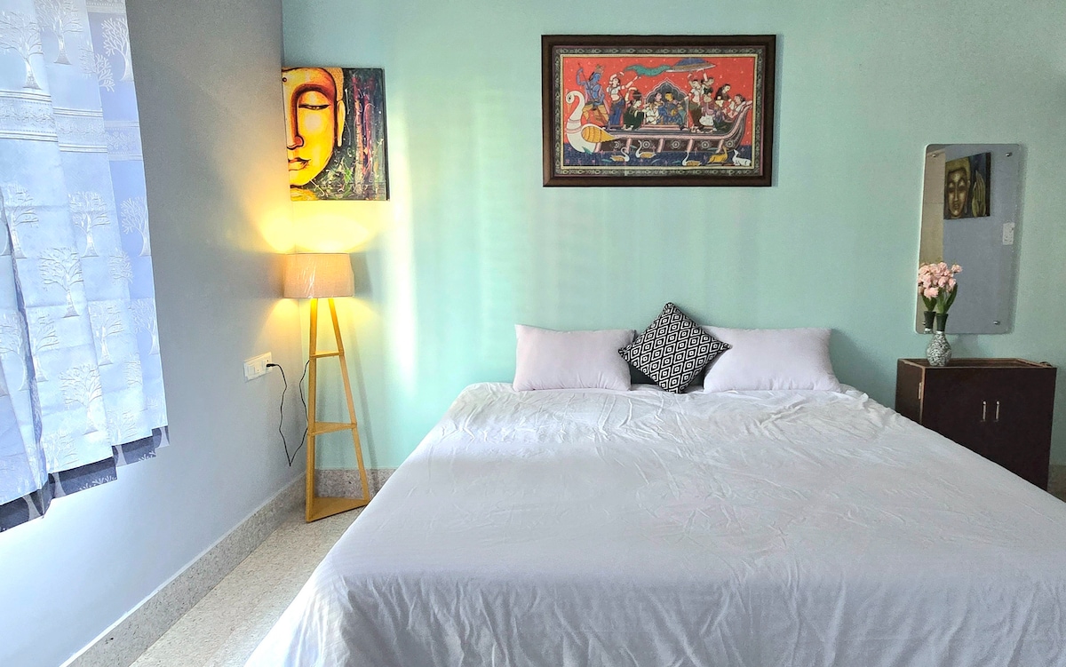 500 Sq. ft. Ganap na independiyenteng Bahay para sa mga Bisita. Isang property na may kumpletong kagamitan na 1 - Bhk sa loob ng kilalang Gated Community (malapit sa Beach) na may tahimik na kapaligiran at perpektong kapaligiran. Nilagyan ang Property ng lahat ng uri ng mga modernong amenidad at pasilidad. May nakatalagang Tagapangalaga para asikasuhin ang mga rekisito ng Bisita '. Maraming lugar sa labas sa loob ng complex - Beach Resort, Swimming Pool, Restaurant, Garden & Play Area atbp. Malapit na Perpektong Lugar ito - TULUYAN na malayo sa TAHANAN !