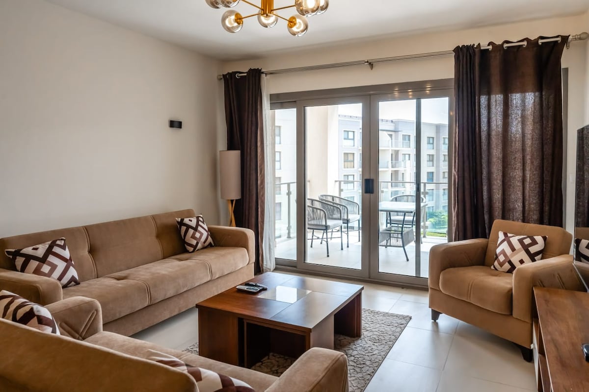 Maligayang pagdating sa iyong perpektong bakasyunan sa gitna ng Lungsod ng New Alamein! Mainam ang modernong apartment na ito na may kumpletong kagamitan para sa mga pamilya o kaibigan na naghahanap ng nakakarelaks na bakasyunan o masayang beach holiday sa nakamamanghang hilagang baybayin ng Egypt🌊 (متاح ايجار سنوي) (Available para sa taunang upa) • Kusinang kumpleto sa kagamitan •Balkonahe na may tanawin ng mga tore •Aircon sa lahat ng kuwarto •Wi - Fi + Smart TV •24/7 na seguridad + paradahan .sofa open bed