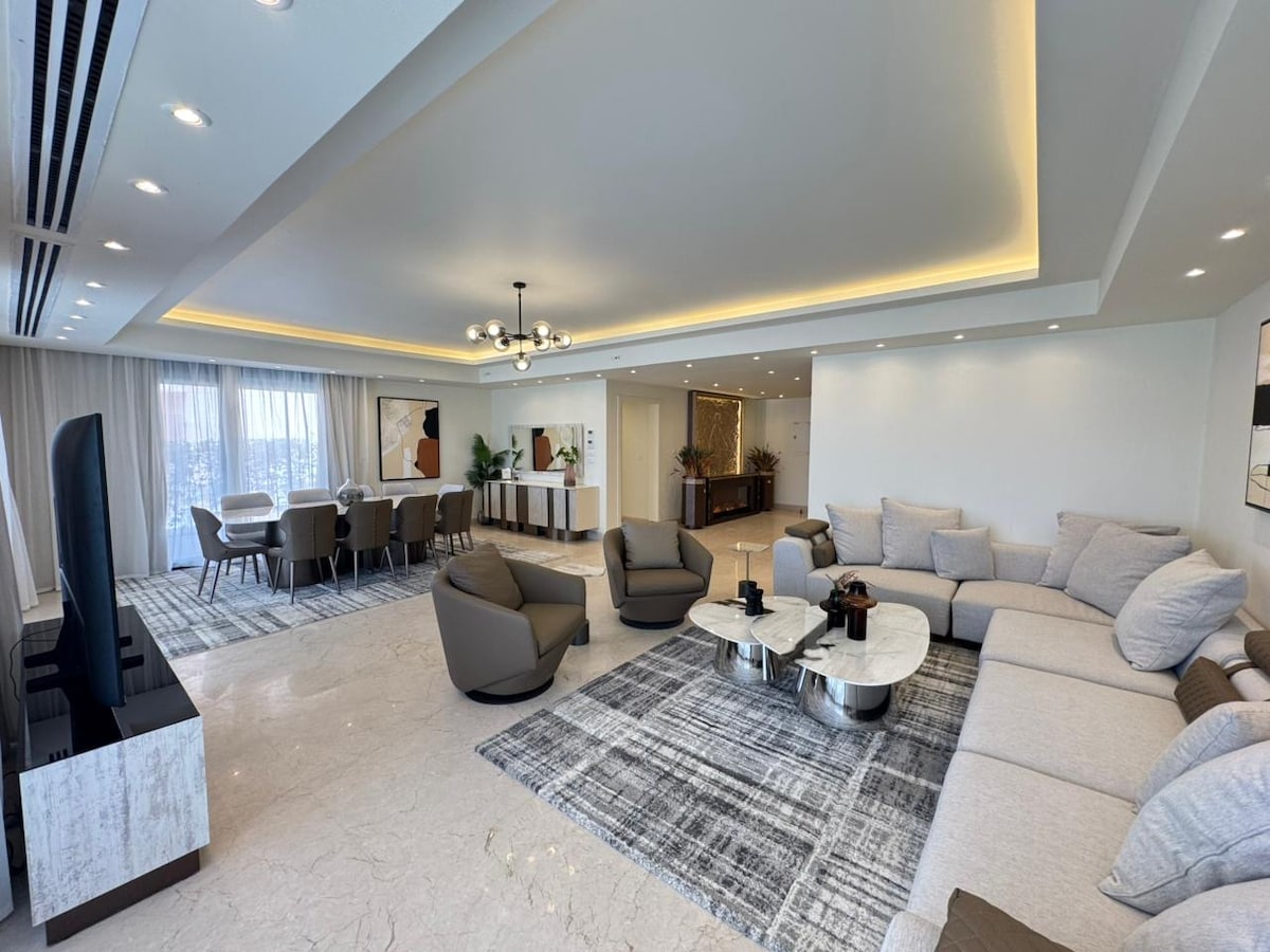 Mararangyang penthouse na may 3 kuwarto at tanawin ng dagat sa Bianchi Sidi Abdelrahman, ikatlong hilera mula sa beach. May 2 master bedroom na may mga en-suite na banyo, mga kuwarto ng katulong at tsuper na may mga banyo, kusinang kumpleto sa gamit na may mga bagong kasangkapan, pribadong garahe para sa 2 kotse na may charging point ng golf cart, at malawak na rooftop na may malawak na tanawin ng dagat na may 3 seating area, bar, at BBQ area. Bago ang lahat ng muwebles at napapanatili ang unit.